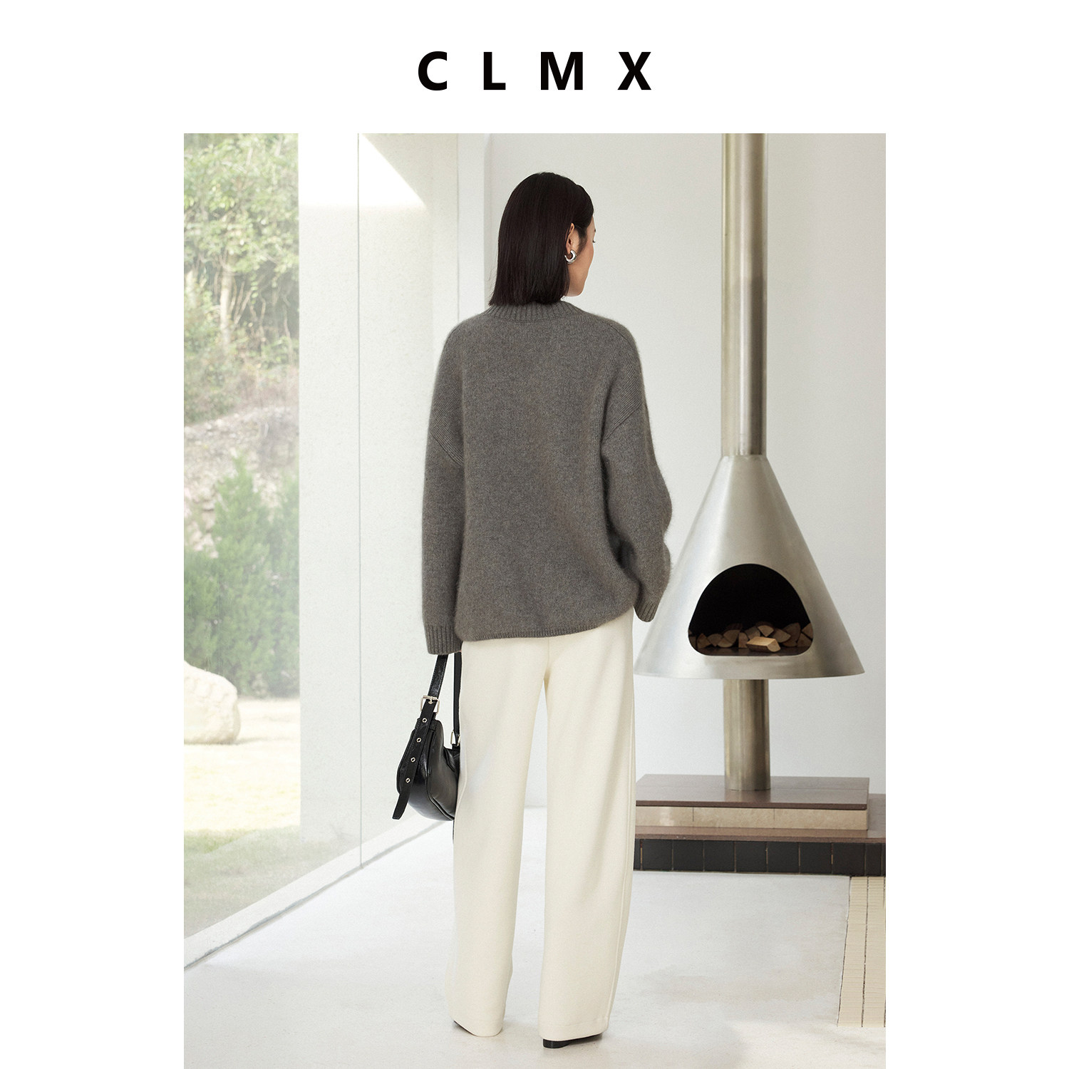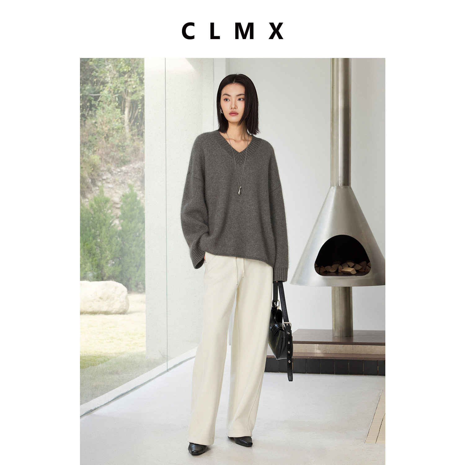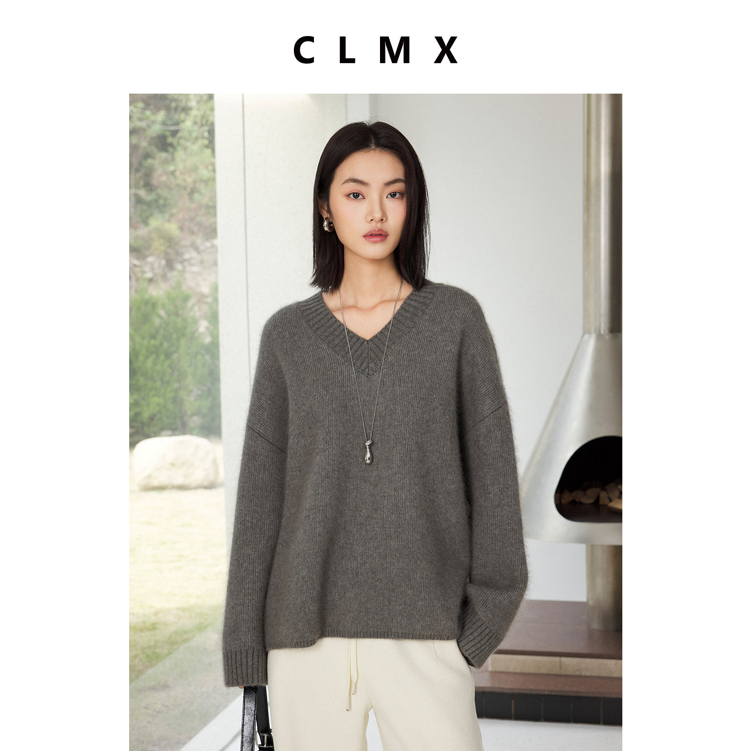 CLMX蓬松亲肤柔绒感羊毛混纺纱线针织衫加厚经典V领长袖套头毛衣