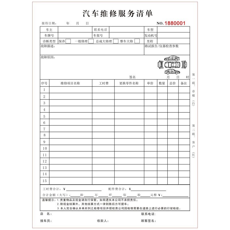 汽车服务结算单据二汽车修理厂接车派工单表格订做