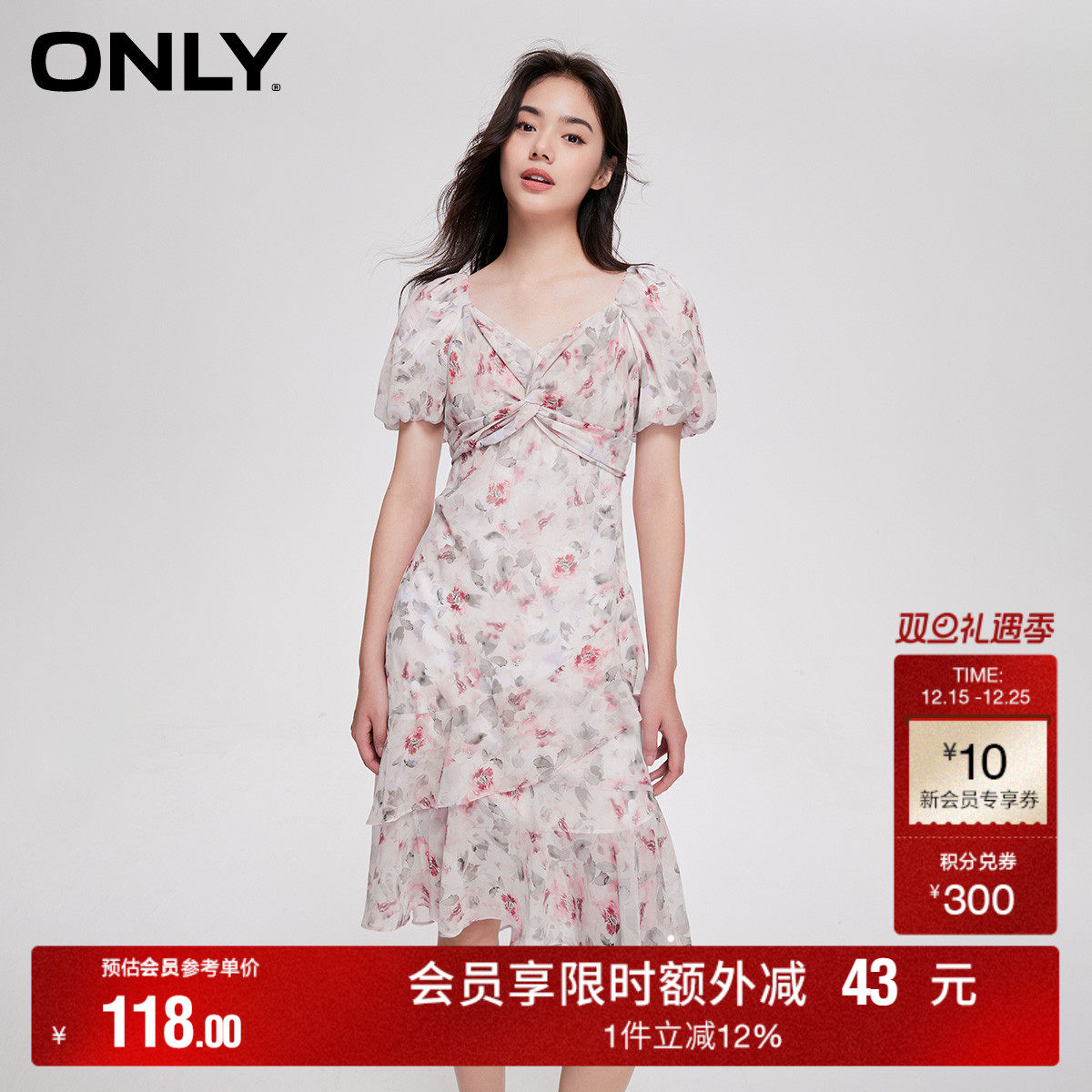 【ONLY奥莱】夏季时尚甜美泡泡袖V领中裙碎花连衣裙女
