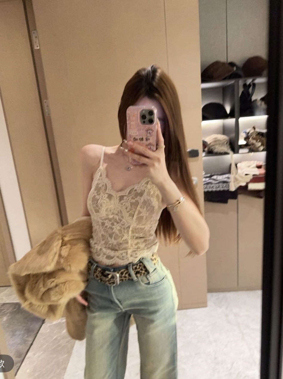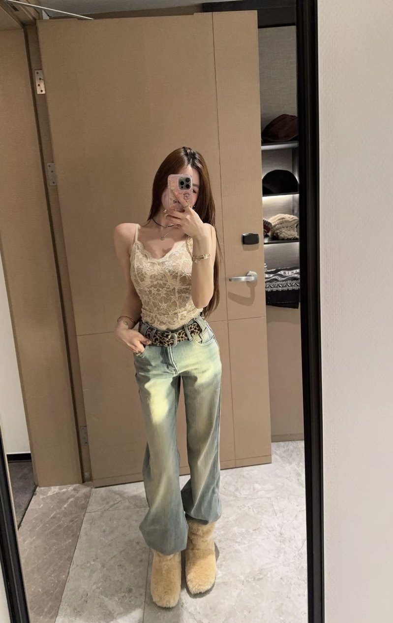 CM原版豹纹腰带复合绒怀旧蓝牛仔裤女2025冬季新款韩版百搭长裤潮