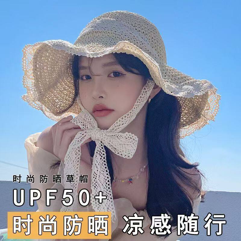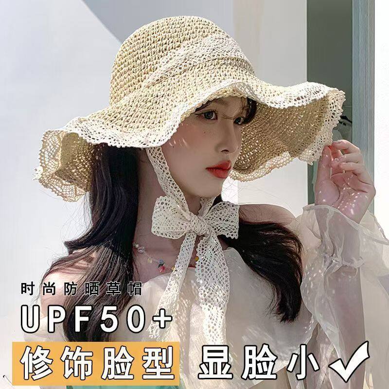 草帽女帽子镂空2025新款夏透气蕾丝花边防晒防晒帽海边遮阳帽大檐