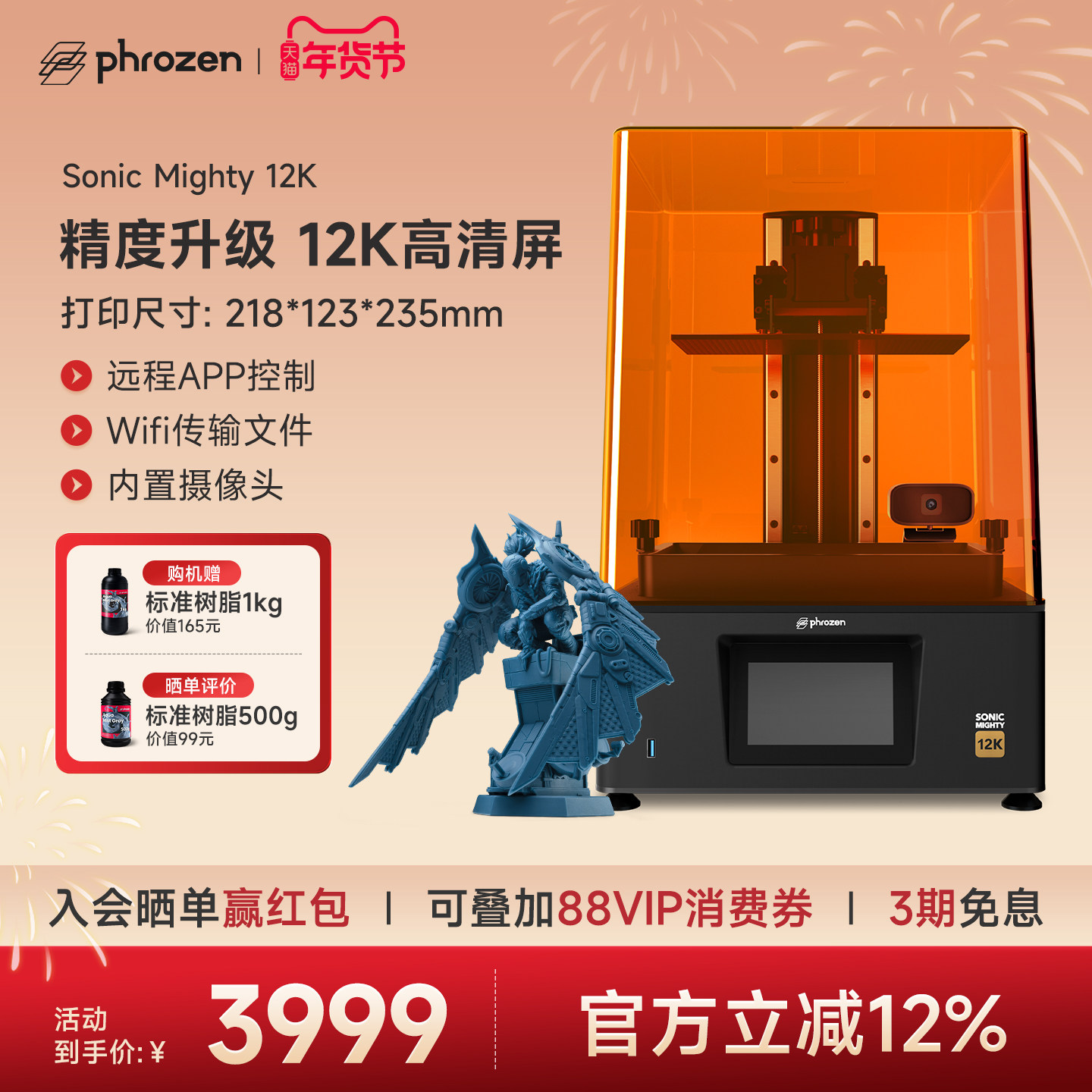 普罗森 Sonic Mighty 8K光固化3d打印机微缩10.1英吋8k黑白屏桌面级28微米高精度手办模型家用3d打印机