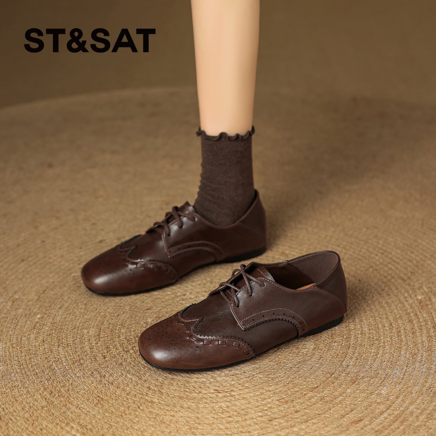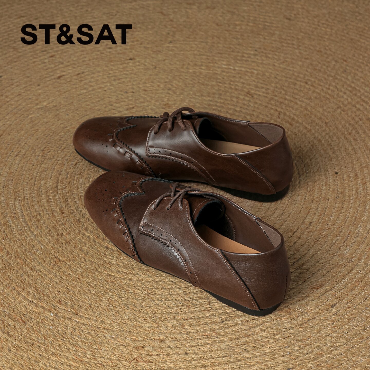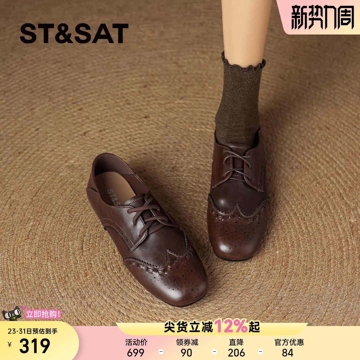 星期六方头乐福鞋女2026新款春季复古雕花布洛克风通勤爆款小皮鞋