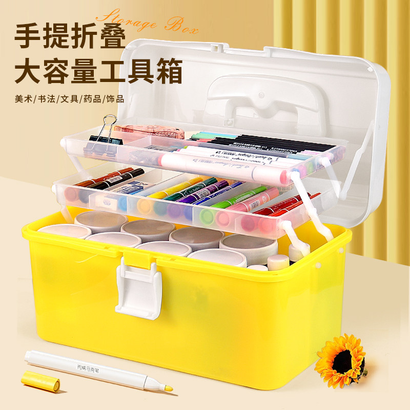 美术收纳工具箱多巴胺色系大容量多功能三层可折叠收纳盒颜料绘画毛笔美甲师化妆品家用透明医药箱