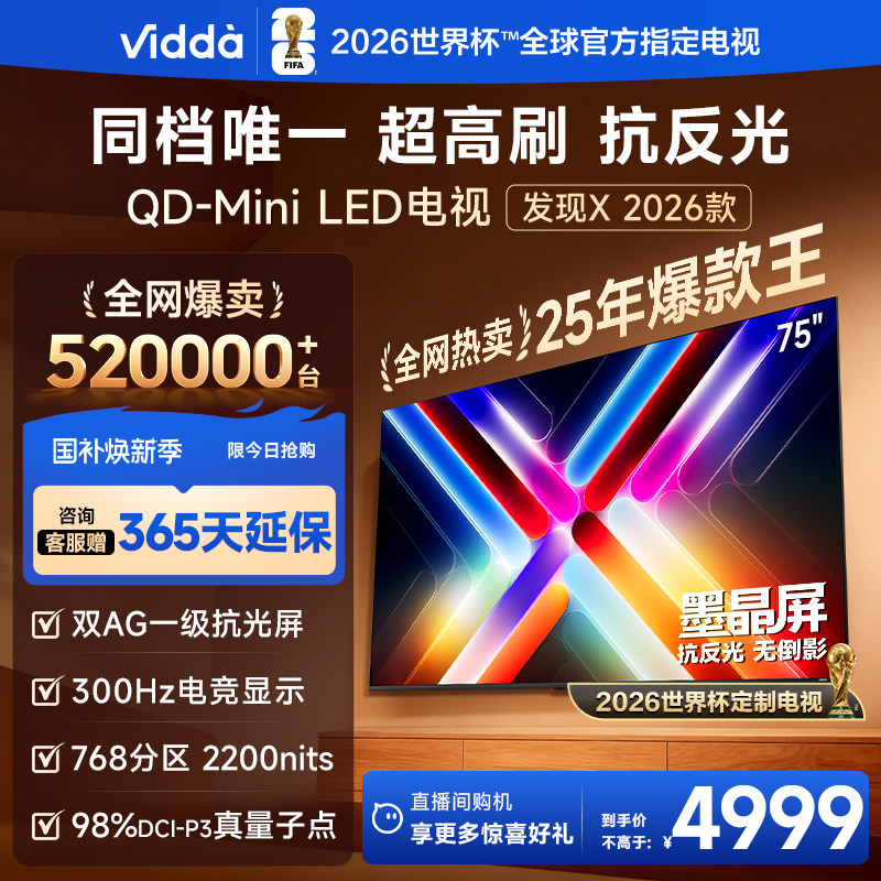 Vidda发现X 2026款 75英寸海信电视机 QD-Mini LED世界杯电视