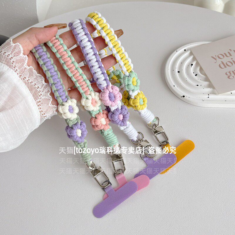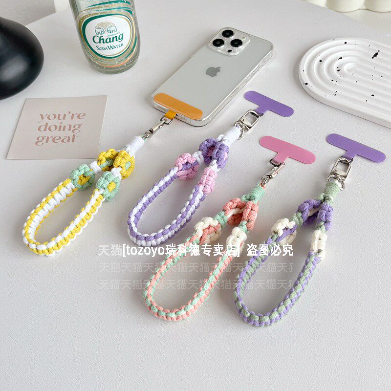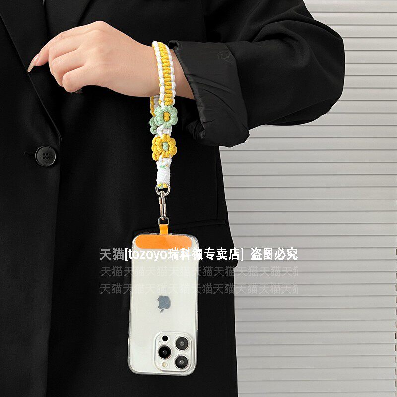 宽版手编手机挂绳小雏菊花花手腕款手绳挂件钥匙扣ccd包包腕带防丢电话带子吊绳结实编织短款女链夹片垫片壳