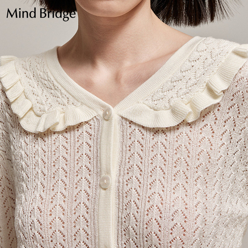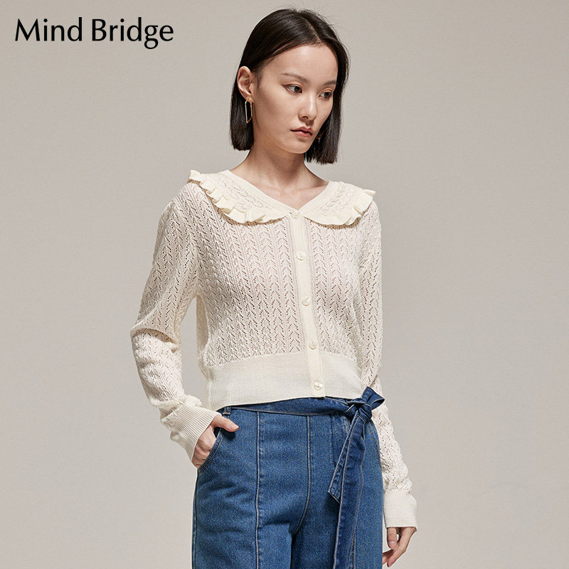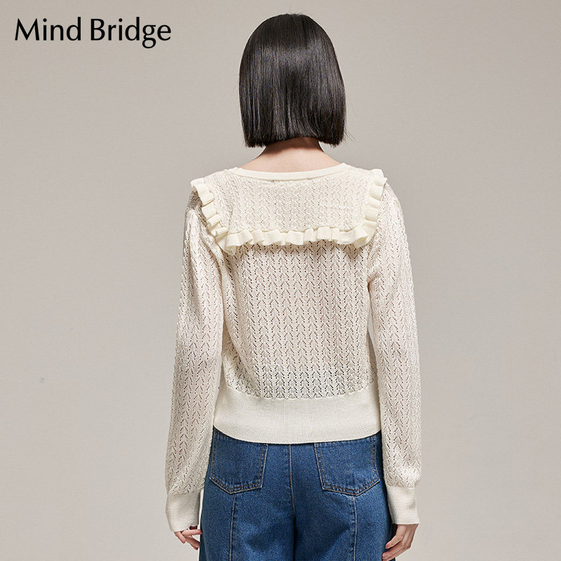 Mind Bridge冬季翻领长袖针织衫女韩版气质V领镂空毛衣木耳边上衣