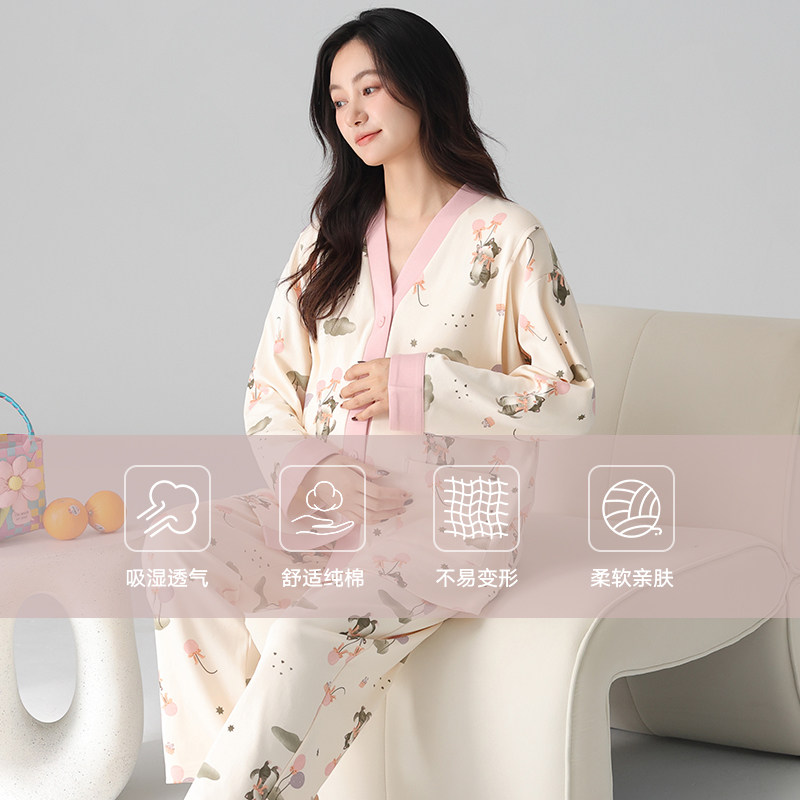 雅鹿月子服纯棉带胸垫产后哺乳产妇孕妇睡衣秋冬不勒肚大码家居服