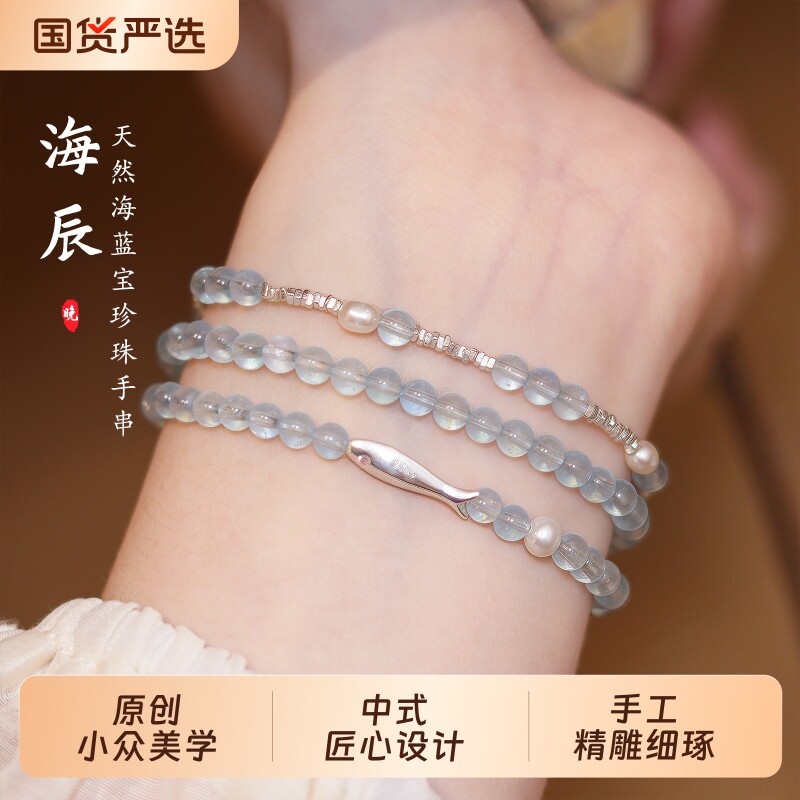 海辰天然海蓝宝水晶手串纯银珍珠手链女款正品轻奢小众碎银三圈