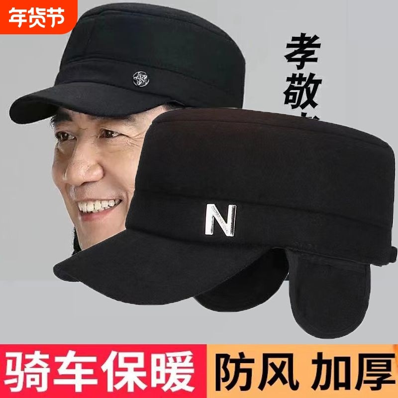 60岁爸爸帽子冬季护耳毛呢帽可调节防寒保暖男士平顶防风骑车休闲