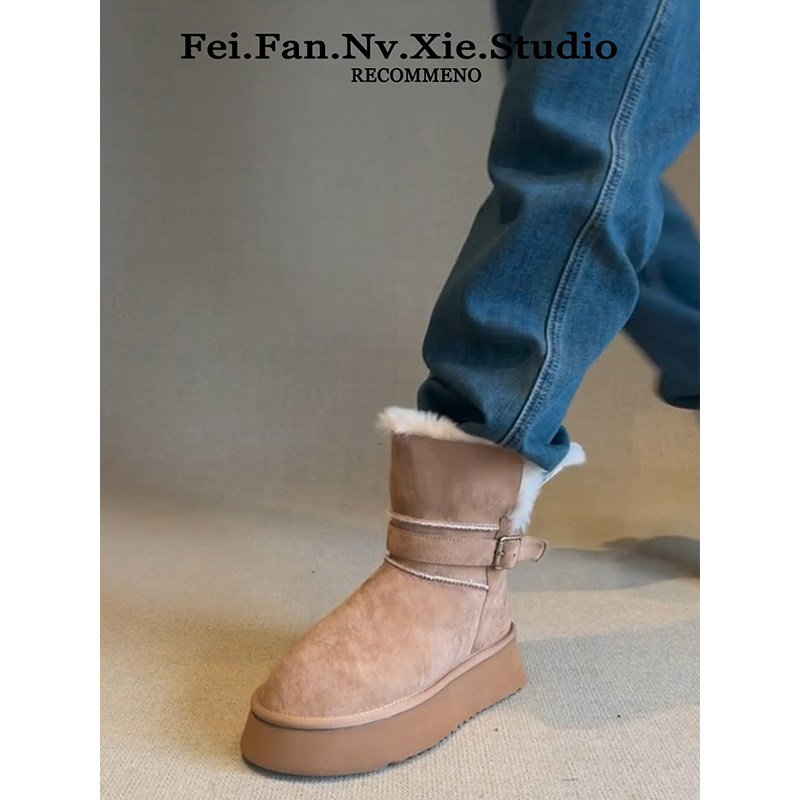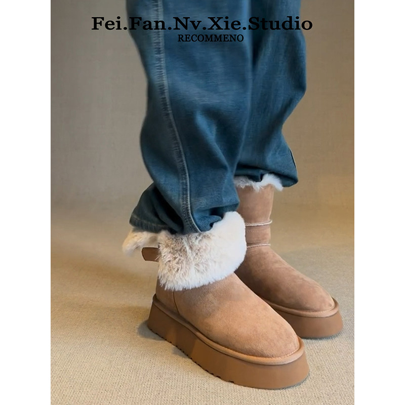 miu家厚底雪地靴女冬季真皮短靴羊毛侧拉链增高厚底加绒毛毛棉鞋