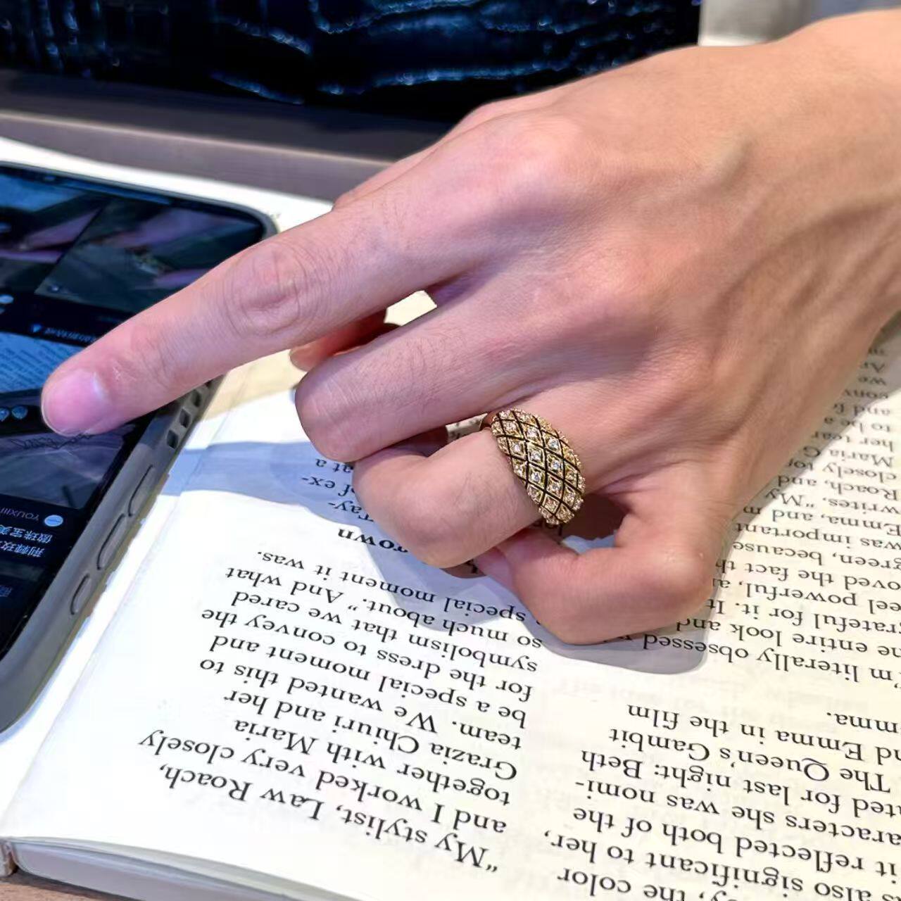 vintage中古黑金色点钻菱格宽面戒指时尚轻奢精致高级百搭食指戒