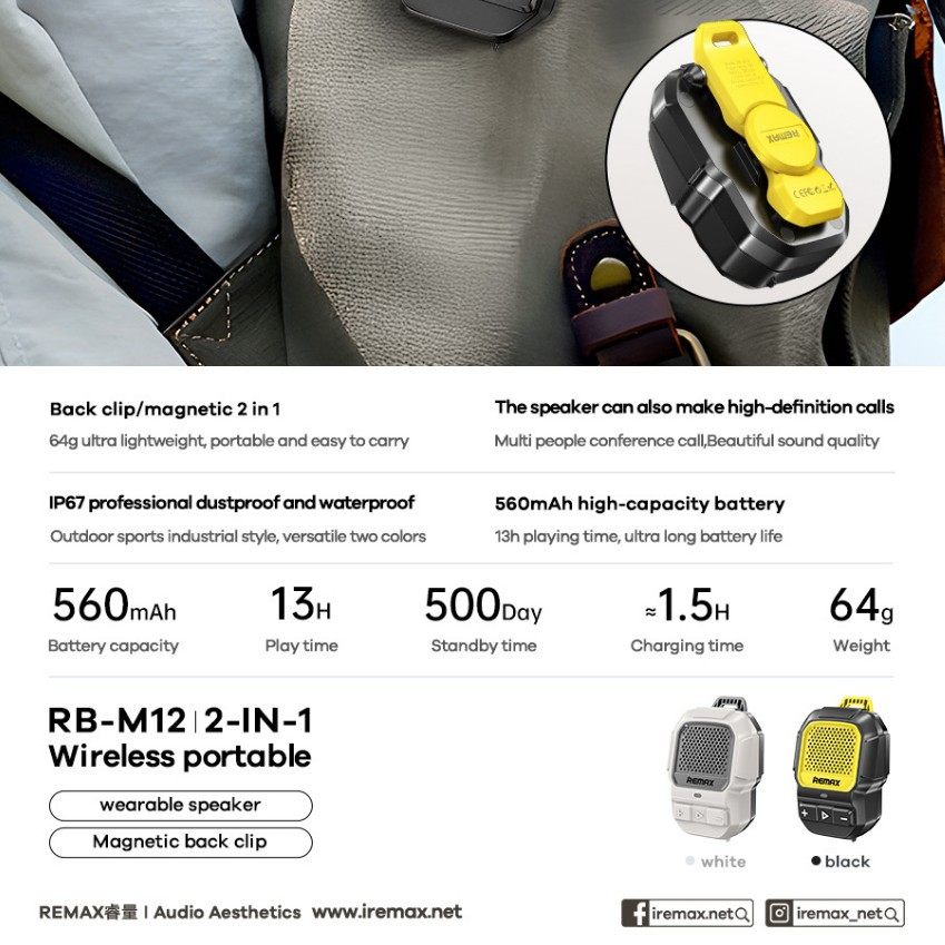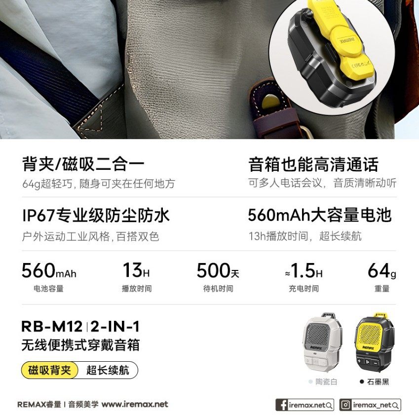 REMAX睿量RB-M12无线背夹磁吸便携式穿戴蓝牙小音箱IP67防水户外