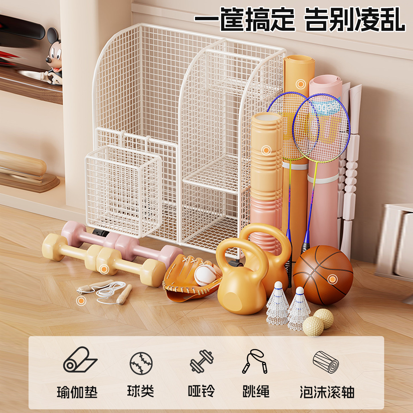 瑜伽垫收纳筐带轮运动健身器材拉伸工具置物架神器羽毛球拍收纳架