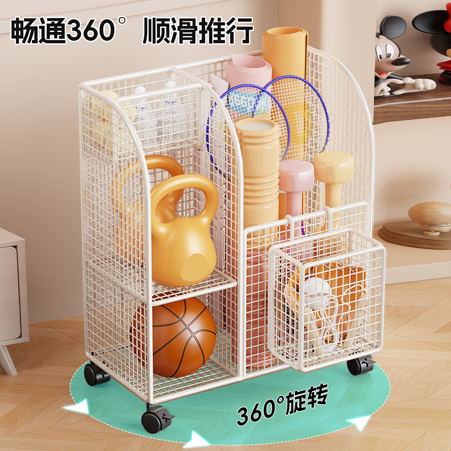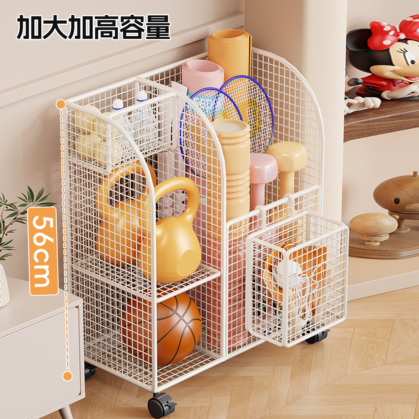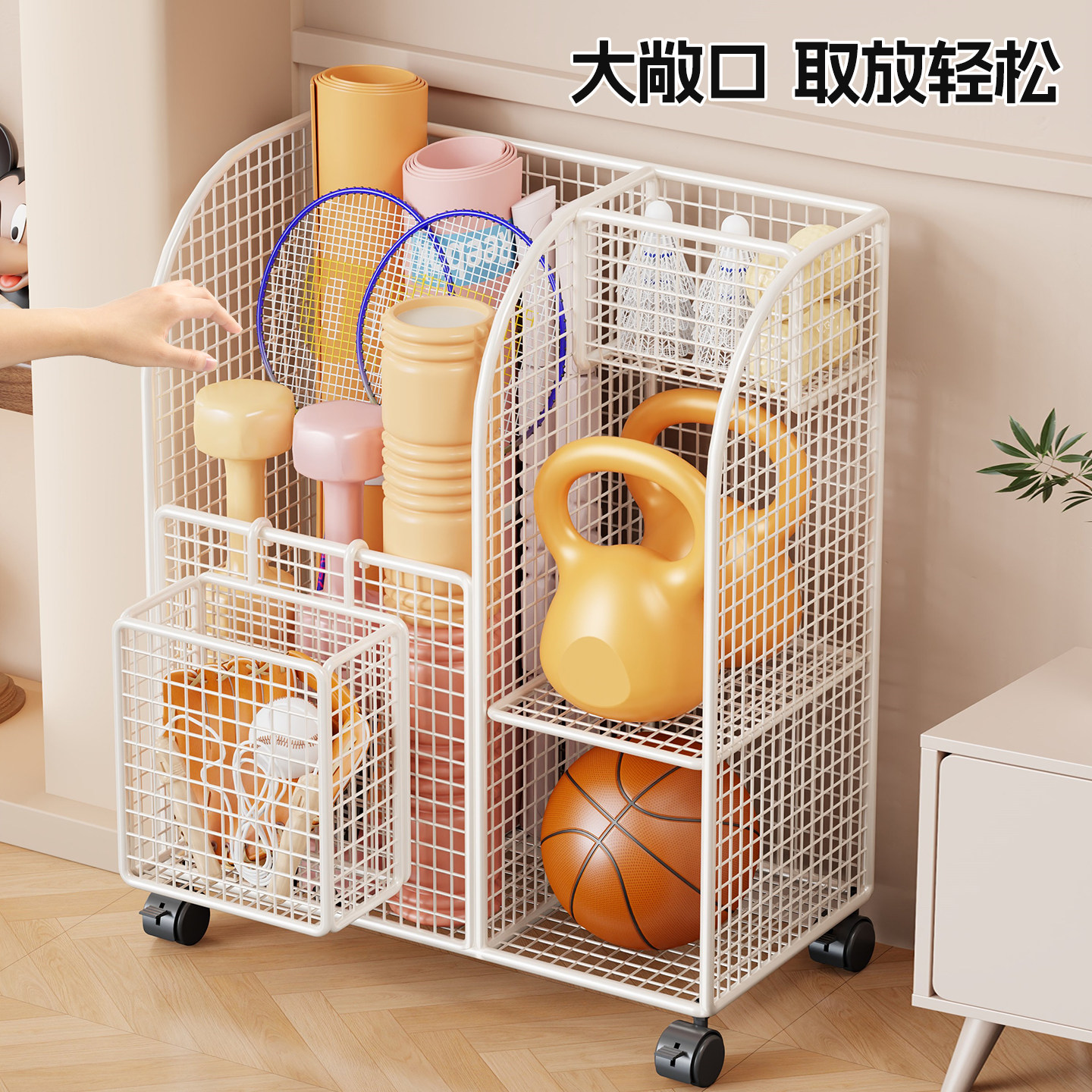 瑜伽垫收纳筐家用大容量带轮羽毛球收纳架客厅大开口可移动存放架