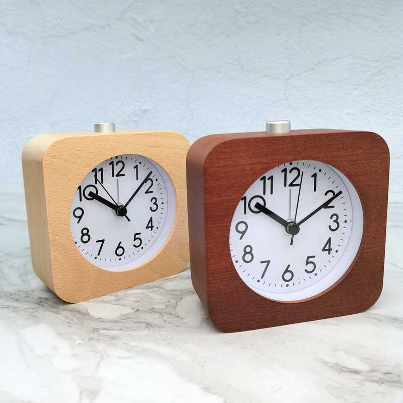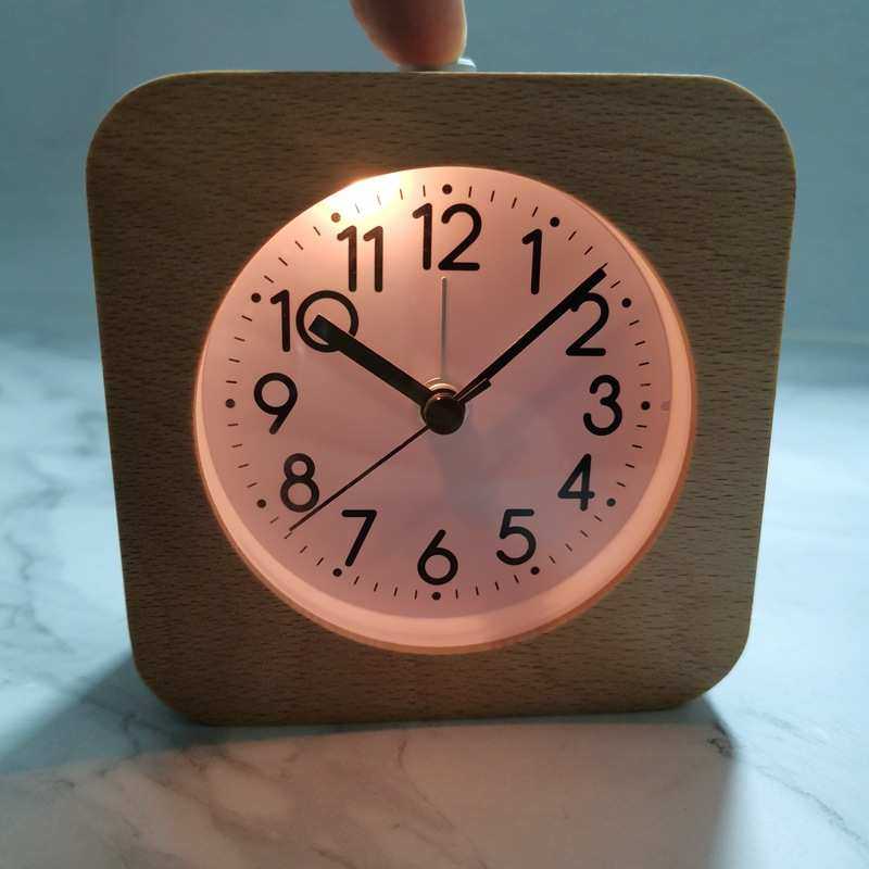 简约北欧榉木实木静音小闹钟带小夜灯贪睡座钟实木手作正方形圆角