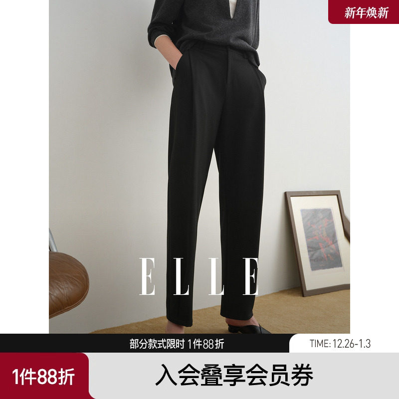 【商场同款】ELLE黑色宽松休闲裤女2025冬季新款小个子高腰哈伦裤