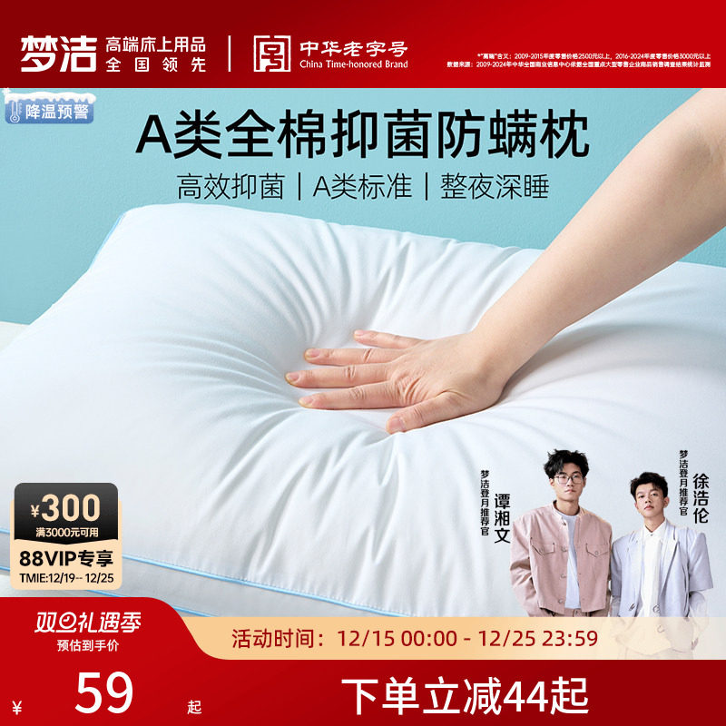 梦洁家纺枕头护颈椎睡眠枕芯纯棉抗菌防螨成人儿童家用学生宿舍枕
