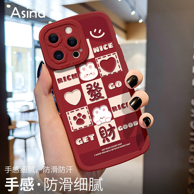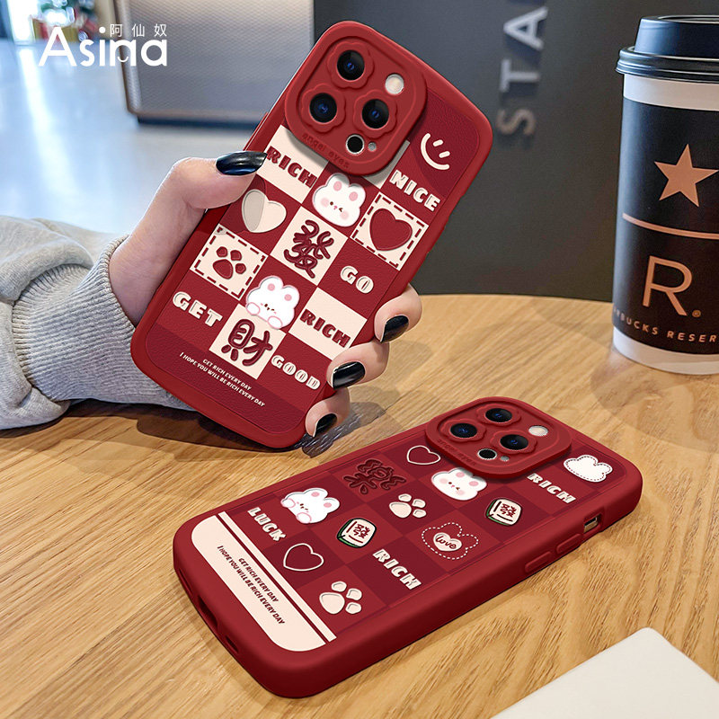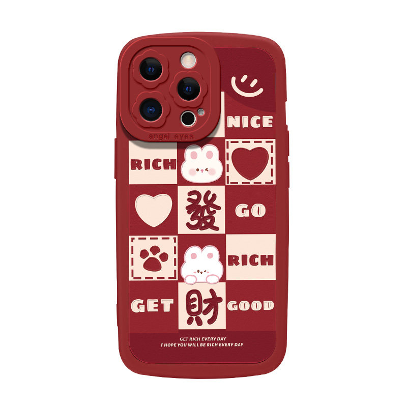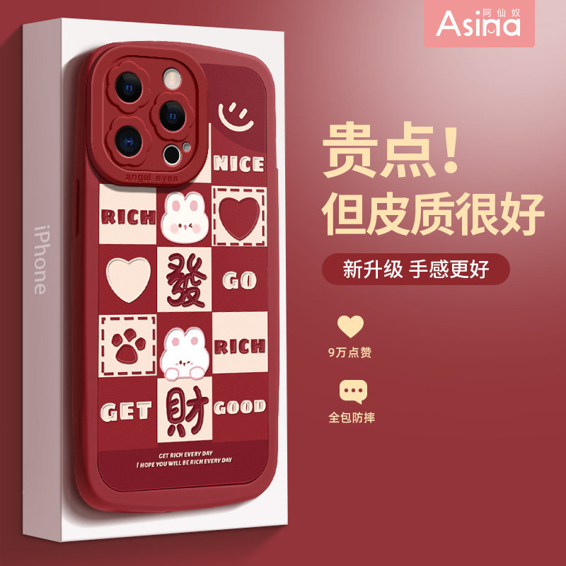 笑脸发财兔兔适用苹果14promax手机壳可爱iPhone13pro小羊皮ip12/11全包x红色新年款xs女款7/8plus新款xsmax