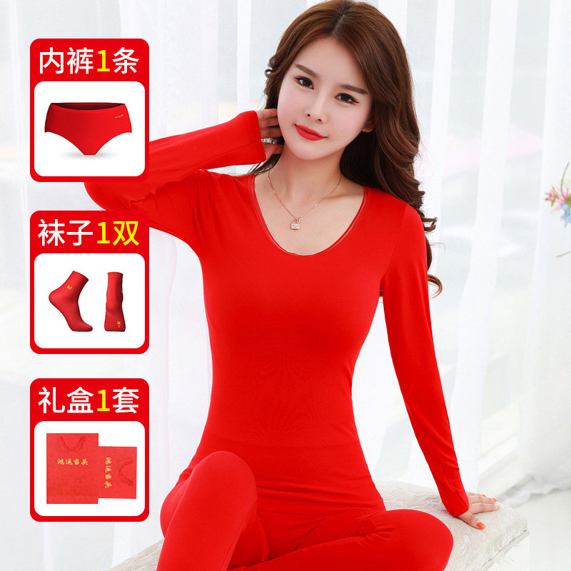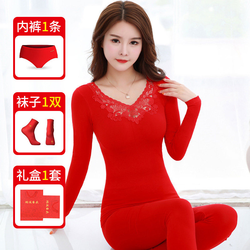 本命年秋衣秋裤套装女属马年新娘打底大红色保暖蕾丝美体时尚塑身