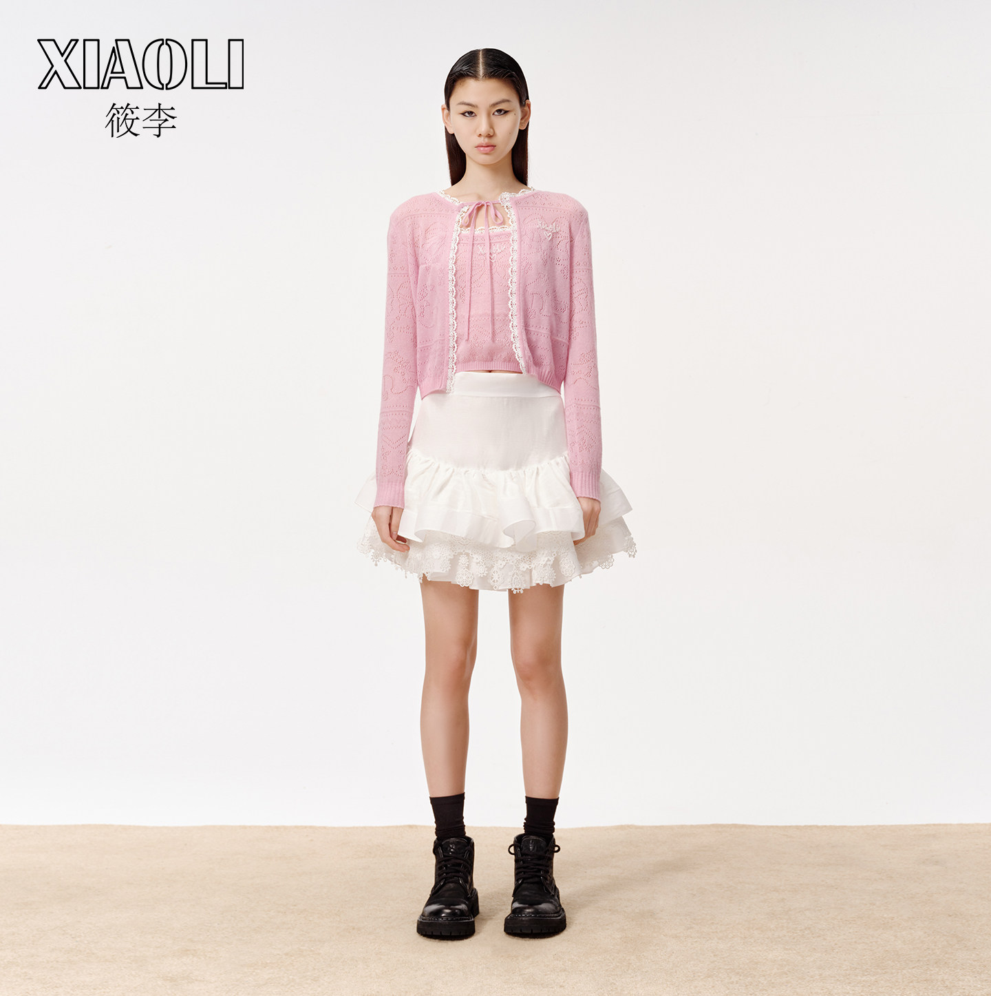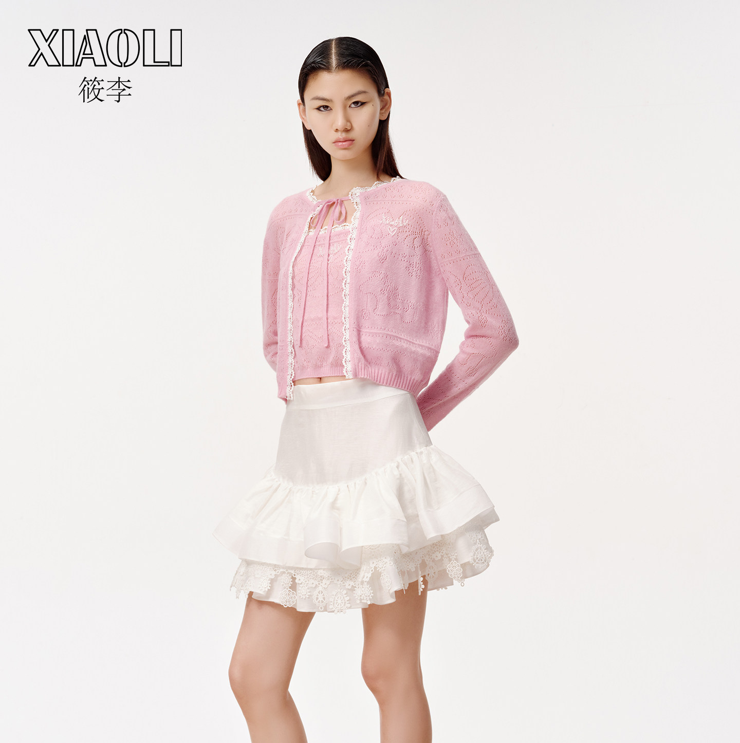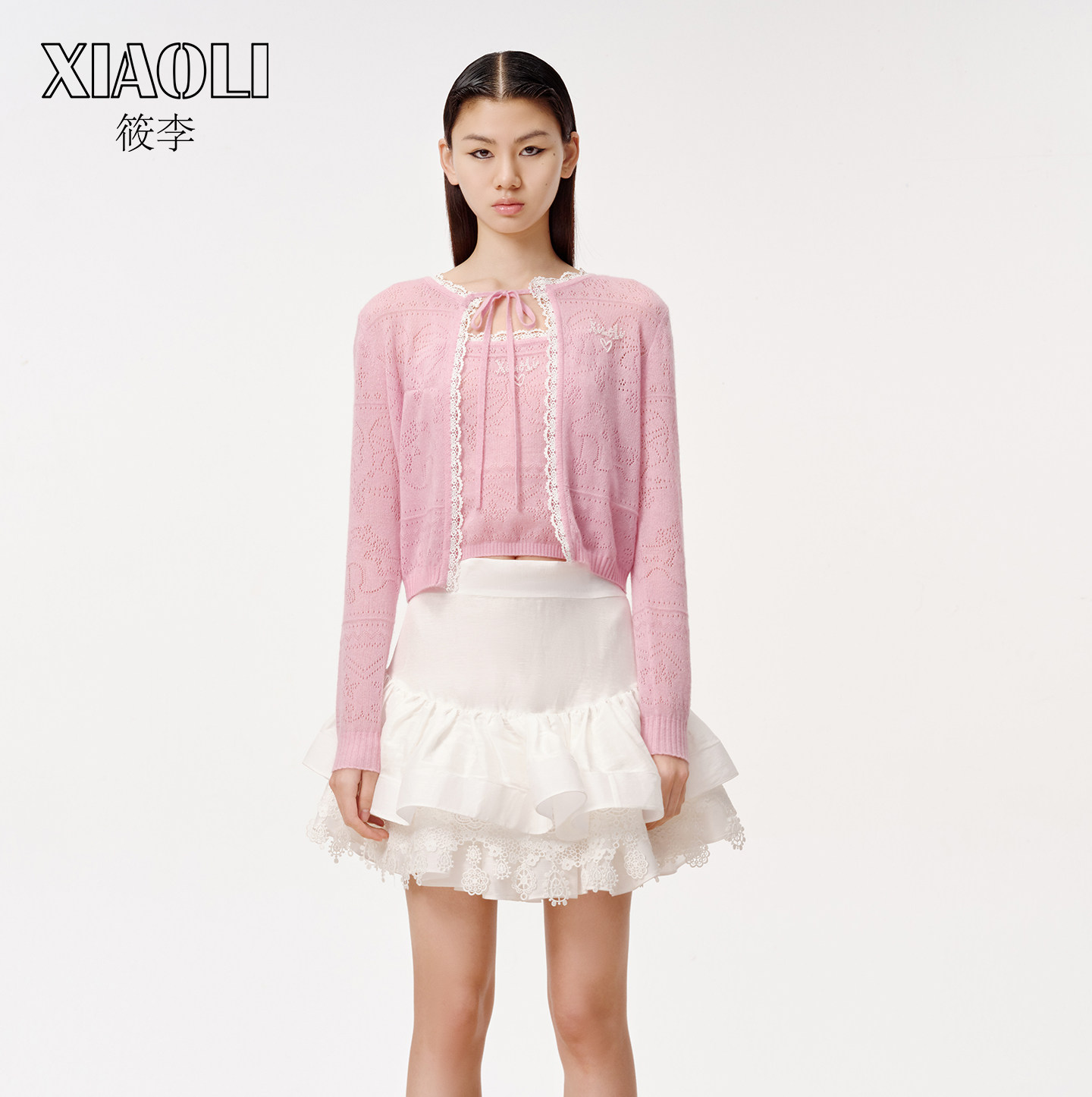 【XIAOLI筱李】法式甜美风粉色针织系带开衫