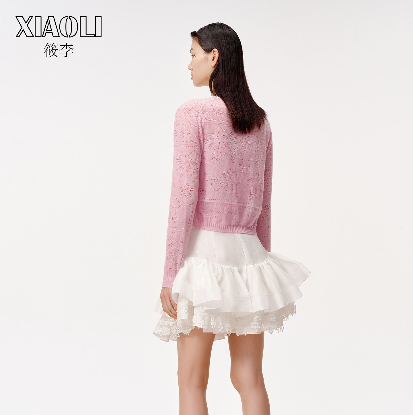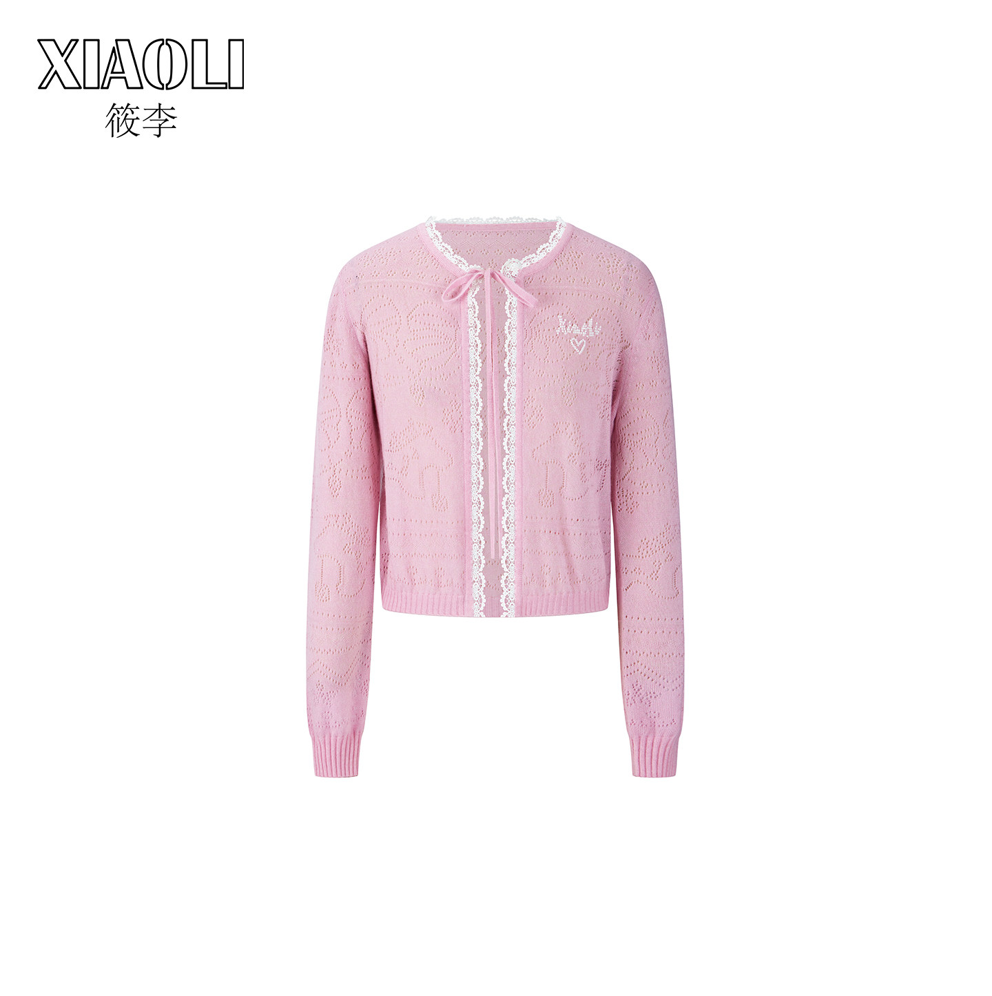 【XIAOLI筱李】法式甜美风粉色丝羊绒挑孔针织系带开衫25秋冬新品