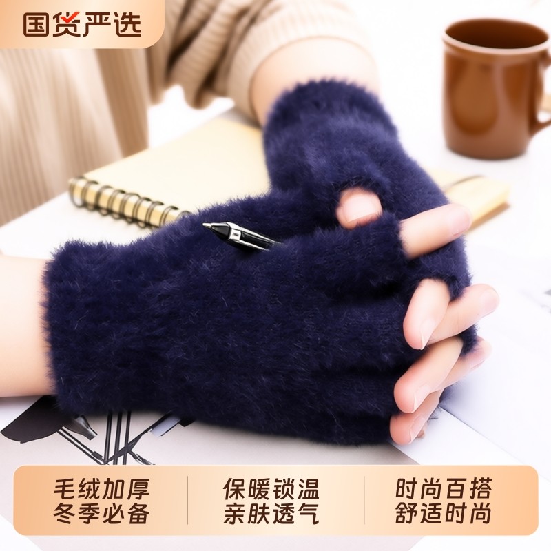 露二指骑行手套保暖冬季触屏韩版毛绒防寒漏指骑车办公写字神器