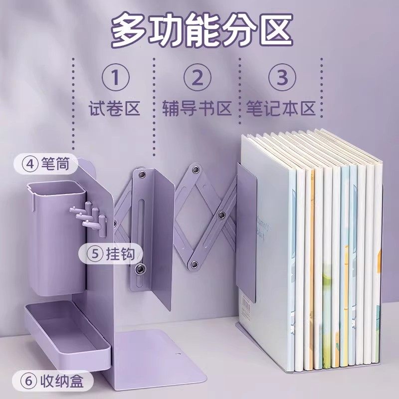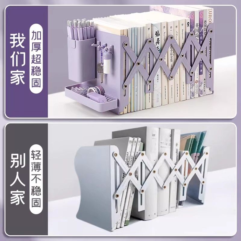 香芋紫伸缩书立小学生书本收纳架置物架多功能笔筒金属可折叠教室桌面课本整理收纳盒学习用品可调节创意书架