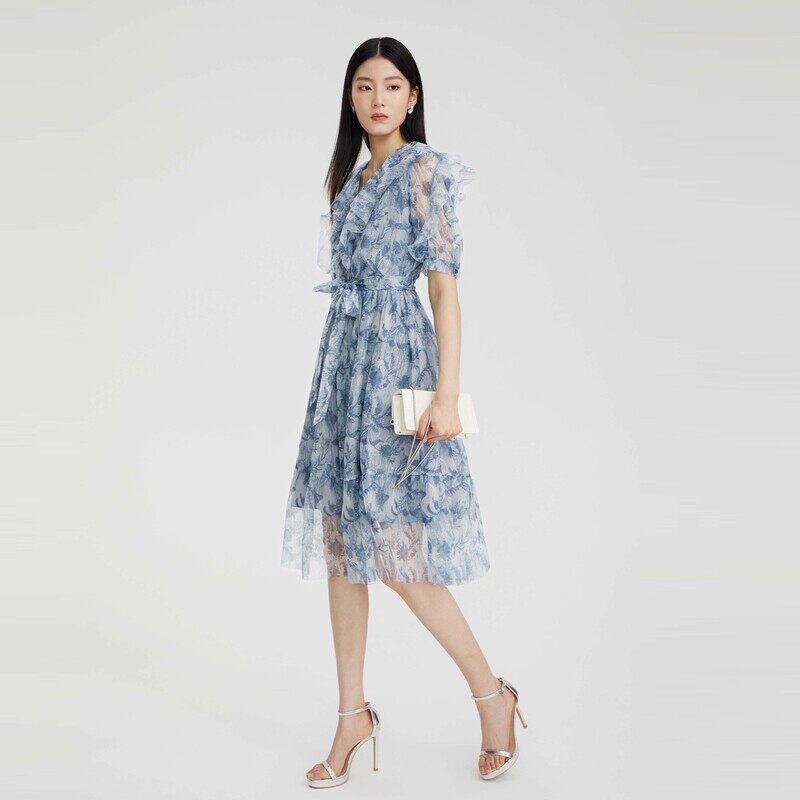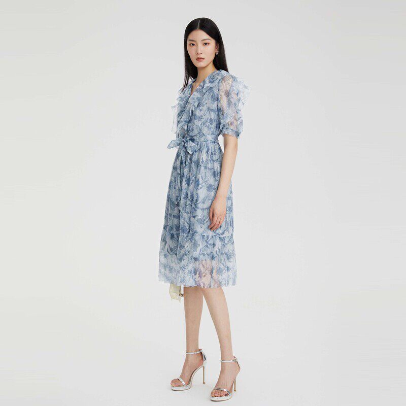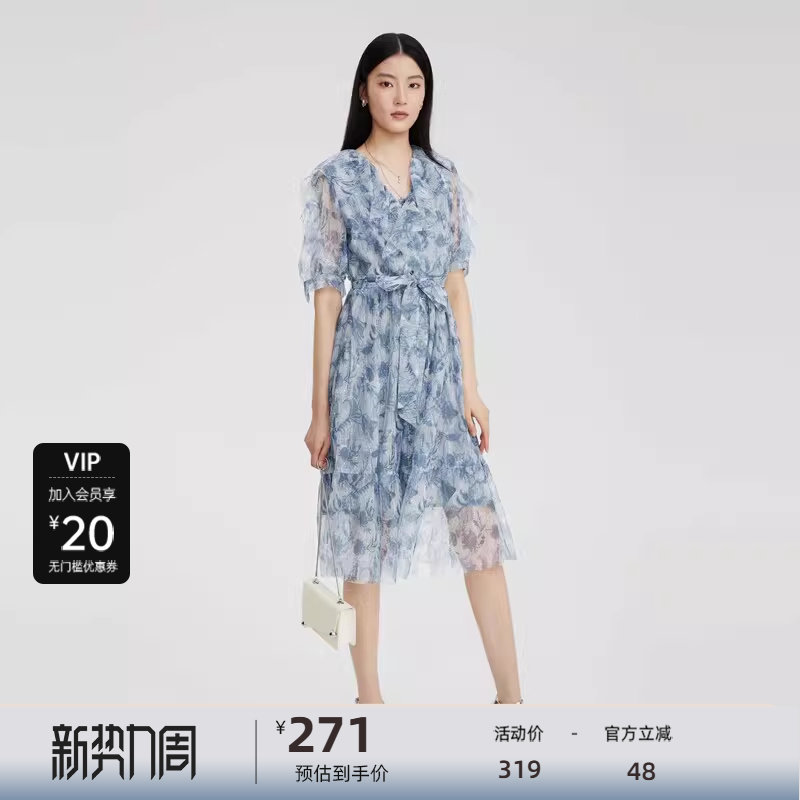 sdeer圣迪奥女装V领晕染收腰网纱泡泡袖连衣裙S232Z1247