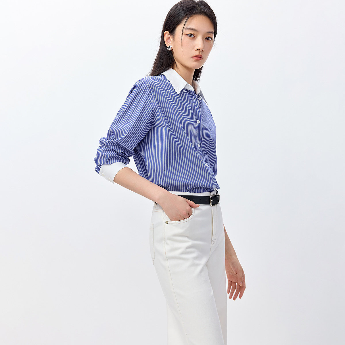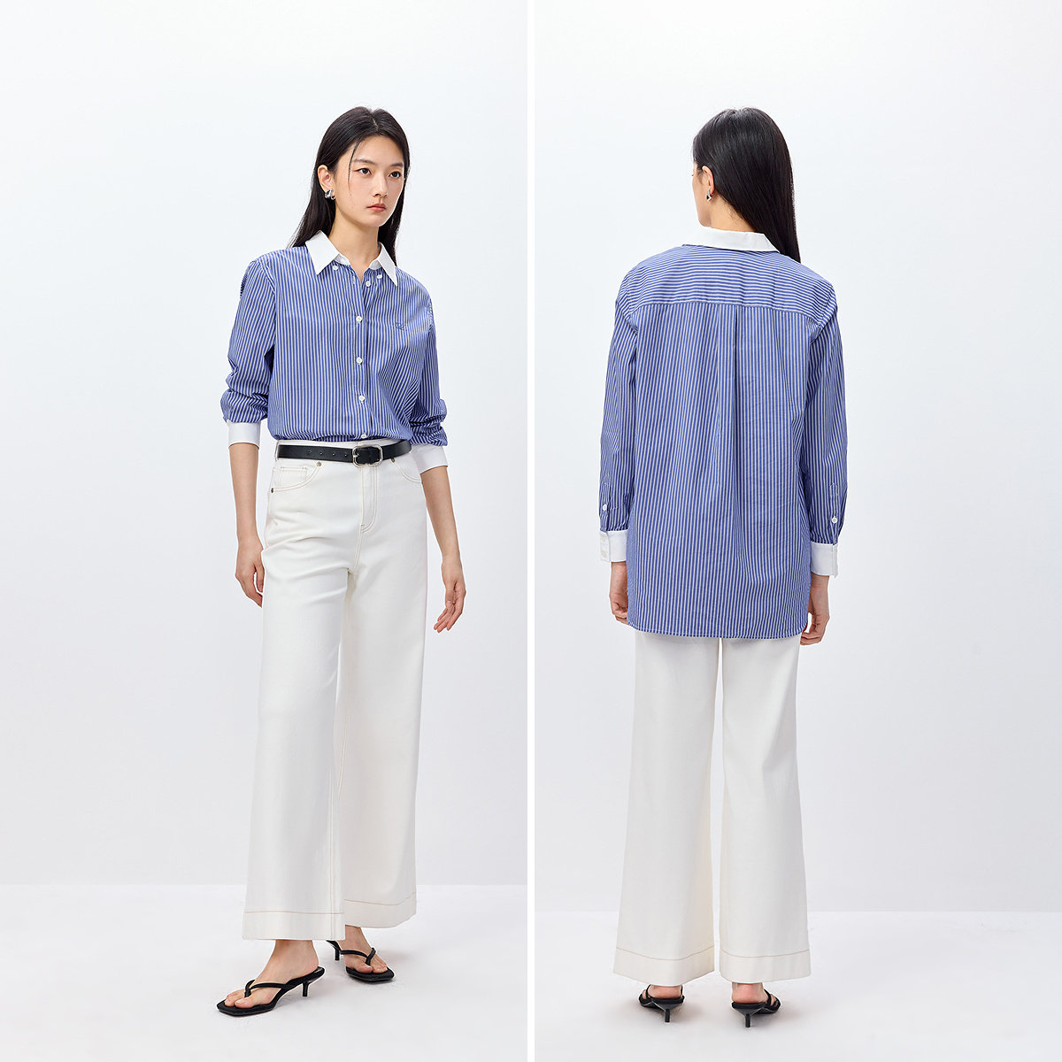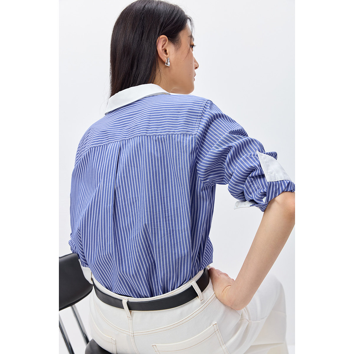 LILY2026春新款经典简约撞色条纹宽松休闲通勤深色长袖衬衫外套女
