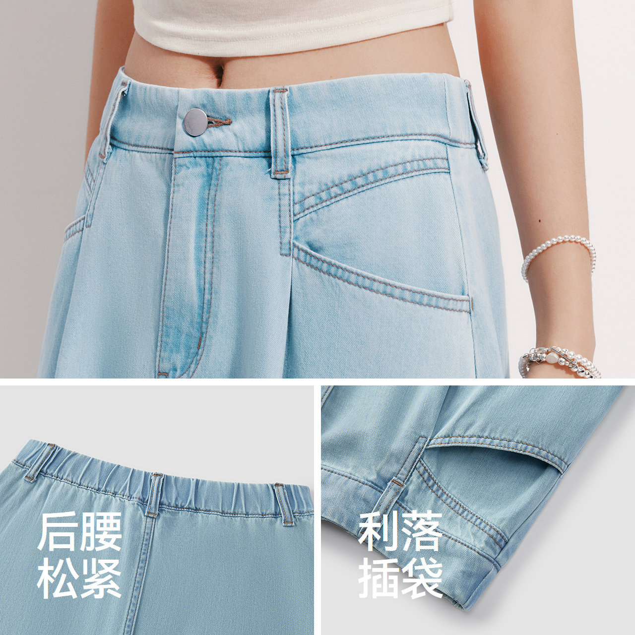 打褶设计遮胯藏小肚子 牛仔蓝有凉感功能