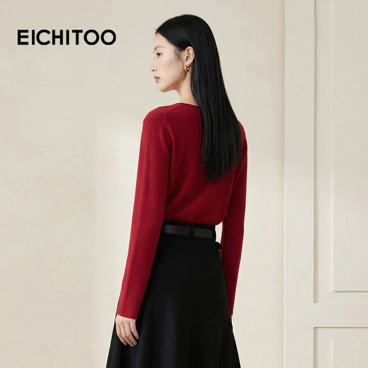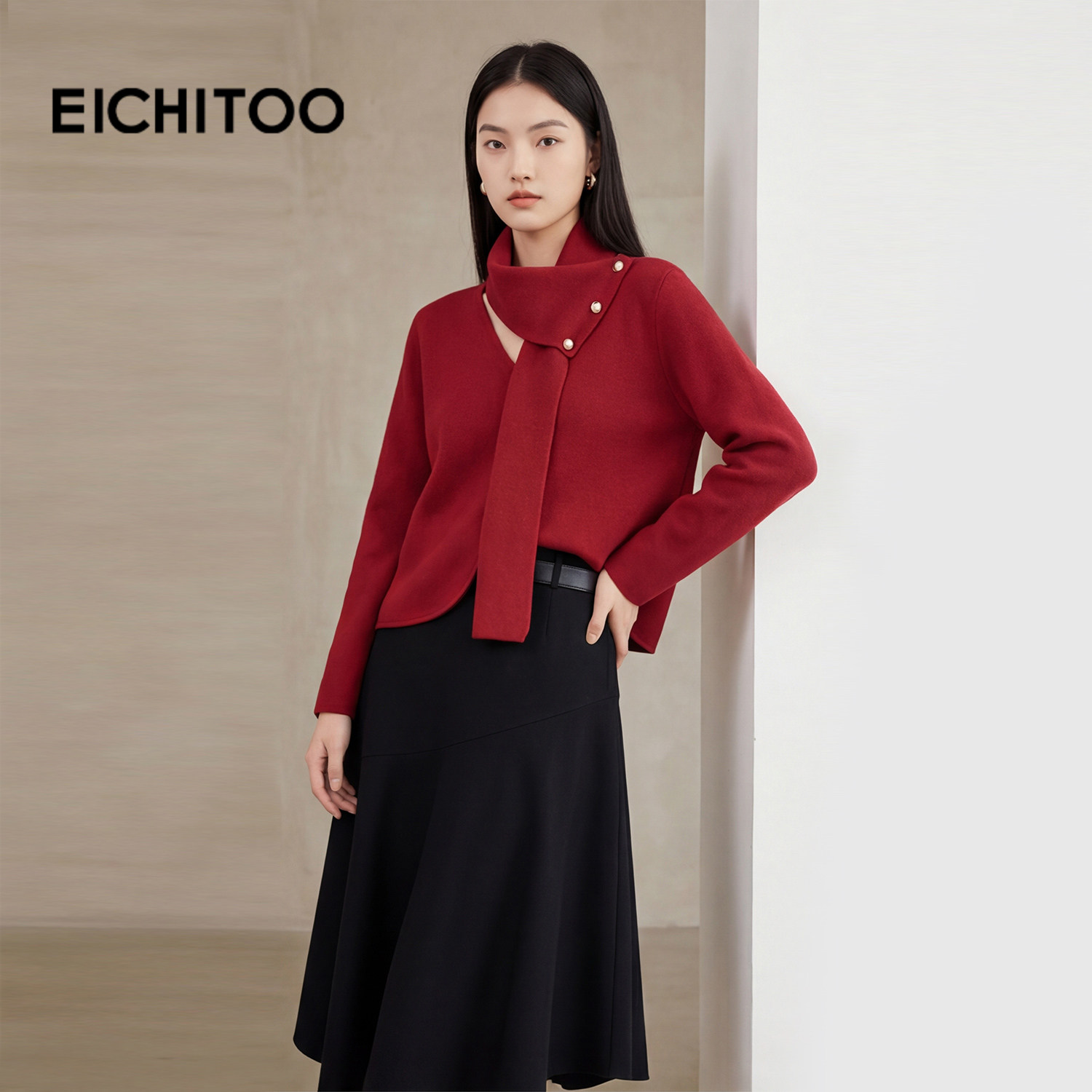 新年红带围脖针织衫