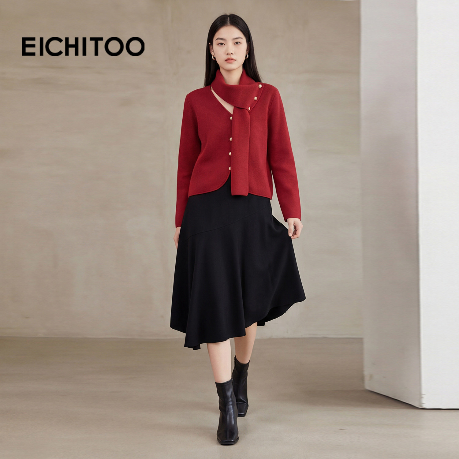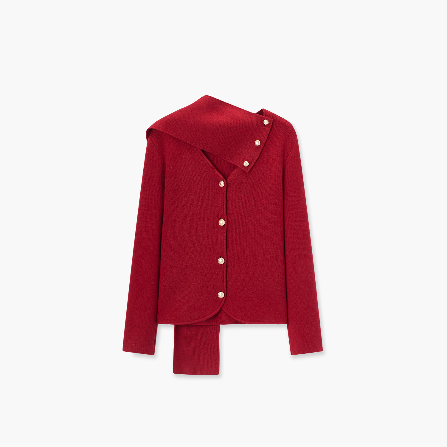 爱居兔红色氛围感带围脖针织开衫女2026年春季新款V领长袖毛衣