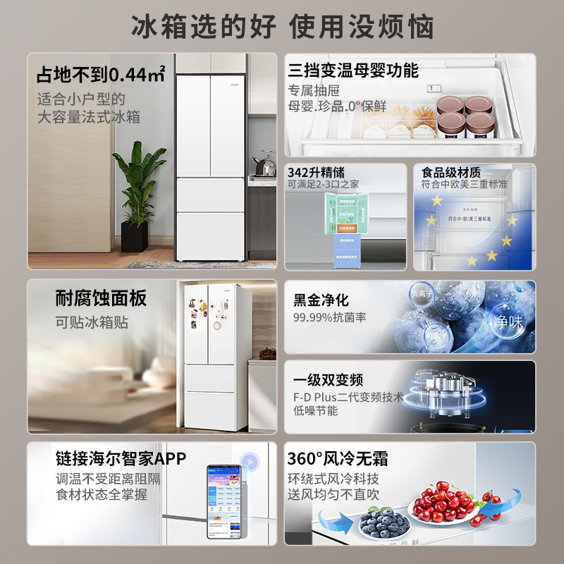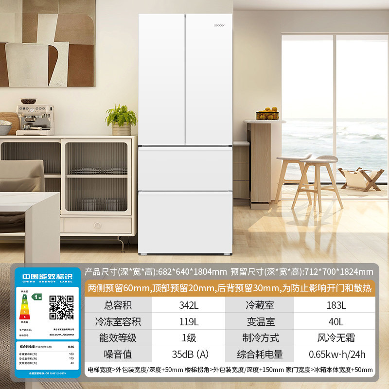 海尔出品统帅电冰箱342L白色法式多门四门风冷无霜一级能效家用