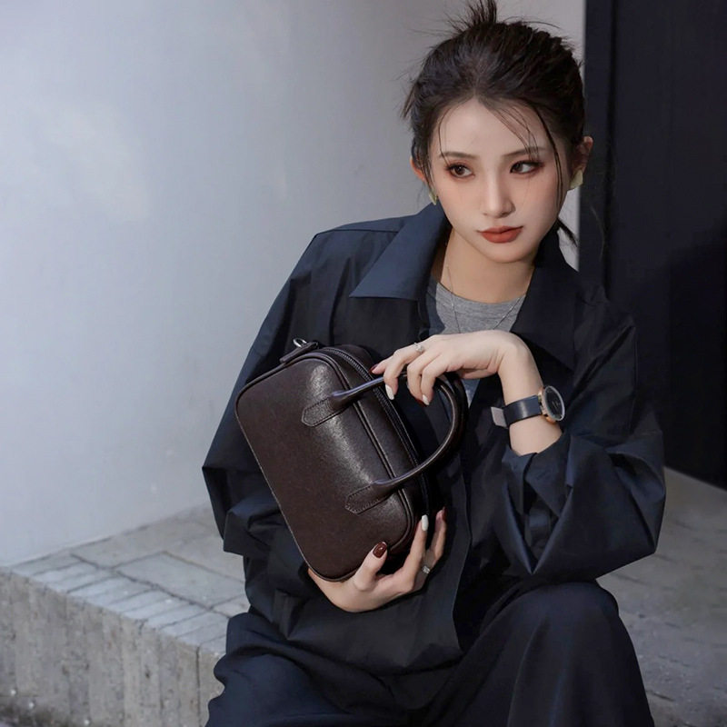 2025高级感植鞣头层牛皮高级波士顿保龄球包女复古通勤手提挎包
