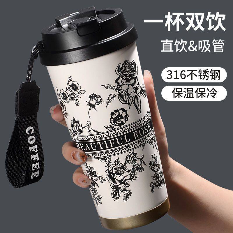 保温杯316不锈钢双饮咖啡杯大容量女高颜值随行吸管水杯情侣杯子