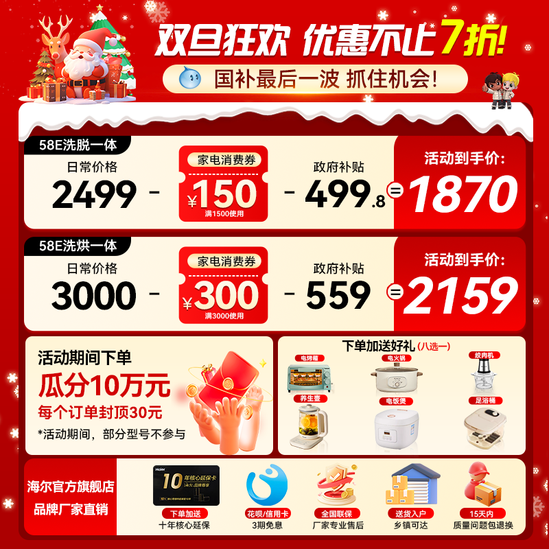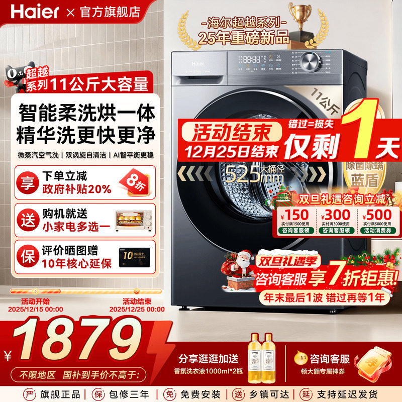 限时7折]海尔滚筒洗衣机11/10公斤小型家用全自动洗烘58E官方旗舰