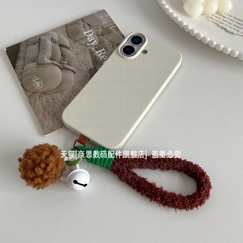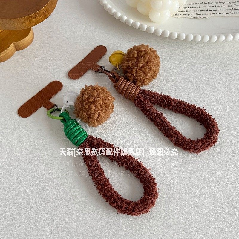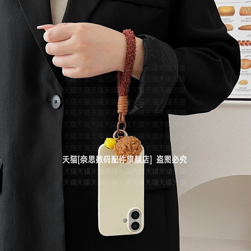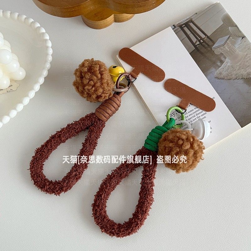 棕色毛绒手机挂绳可爱小铃铛毛球吊坠手腕款挂件冬季腕带手绳耳机优盘相机钥匙扣包包链挂饰女复古高级垫片壳