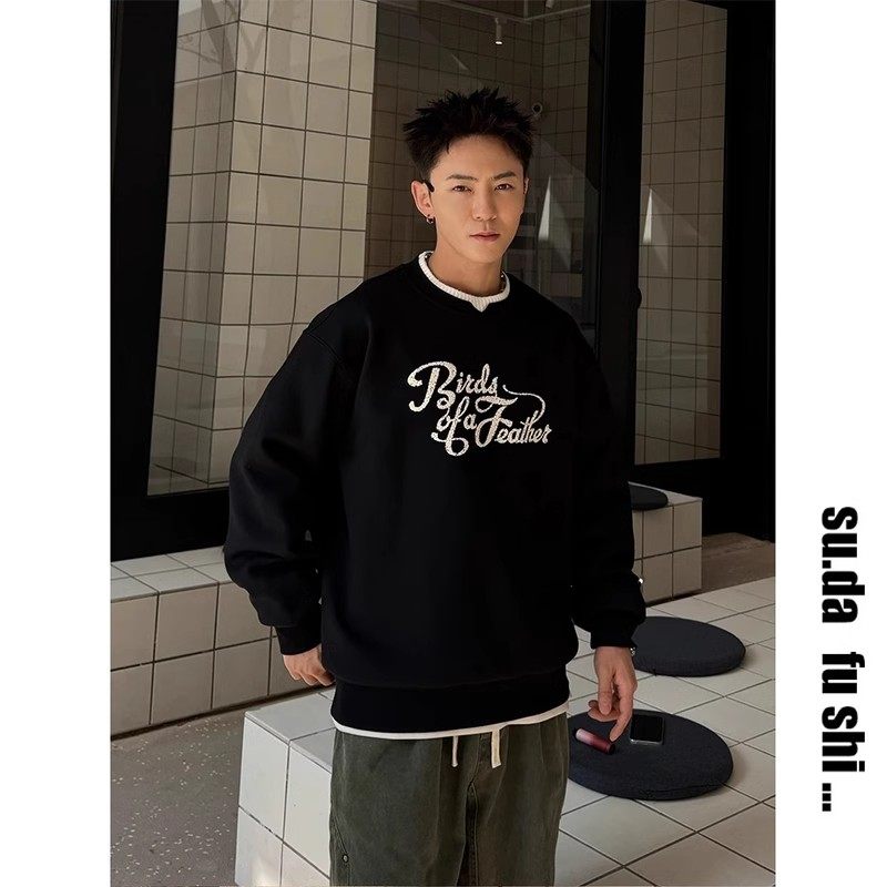 秋冬新款重磅假两件男士卫衣百搭休闲基础大众爆裂印花长袖上衣潮
