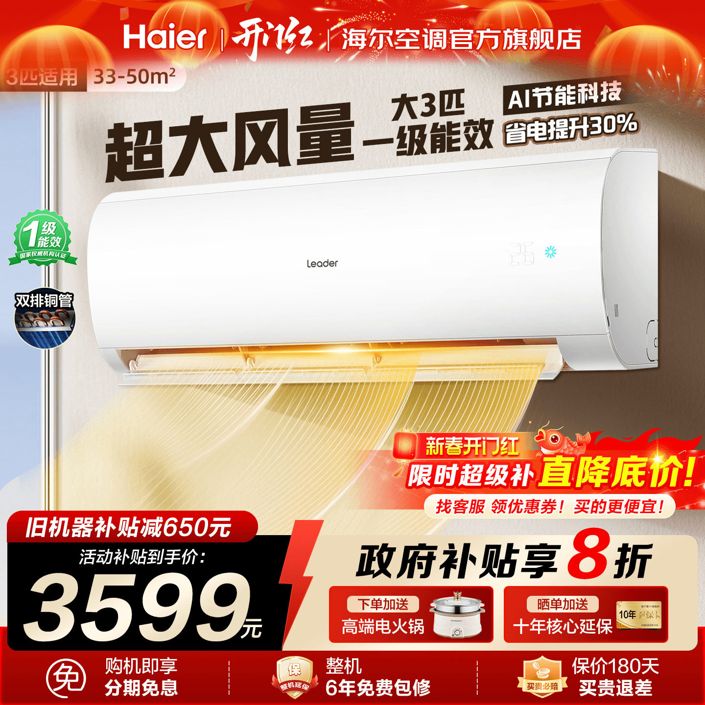 [国补20%】海尔空调2匹3匹大挂机家用一级变频统帅冷暖官方旗舰店