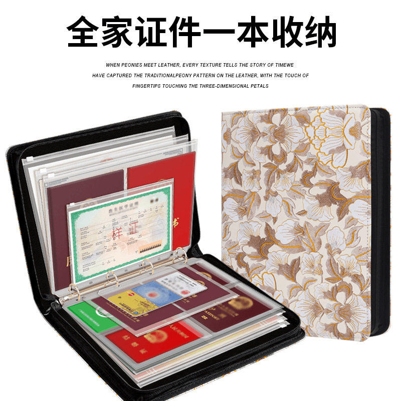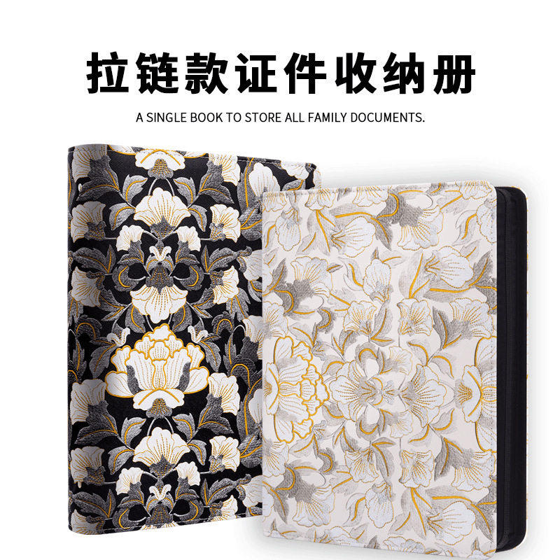 拉链款鎏金牡丹花A4皮质活页资料册4孔皮面房产本孕检资料结婚证收纳册保护套户口本疫苗出生证明护照驾驶证