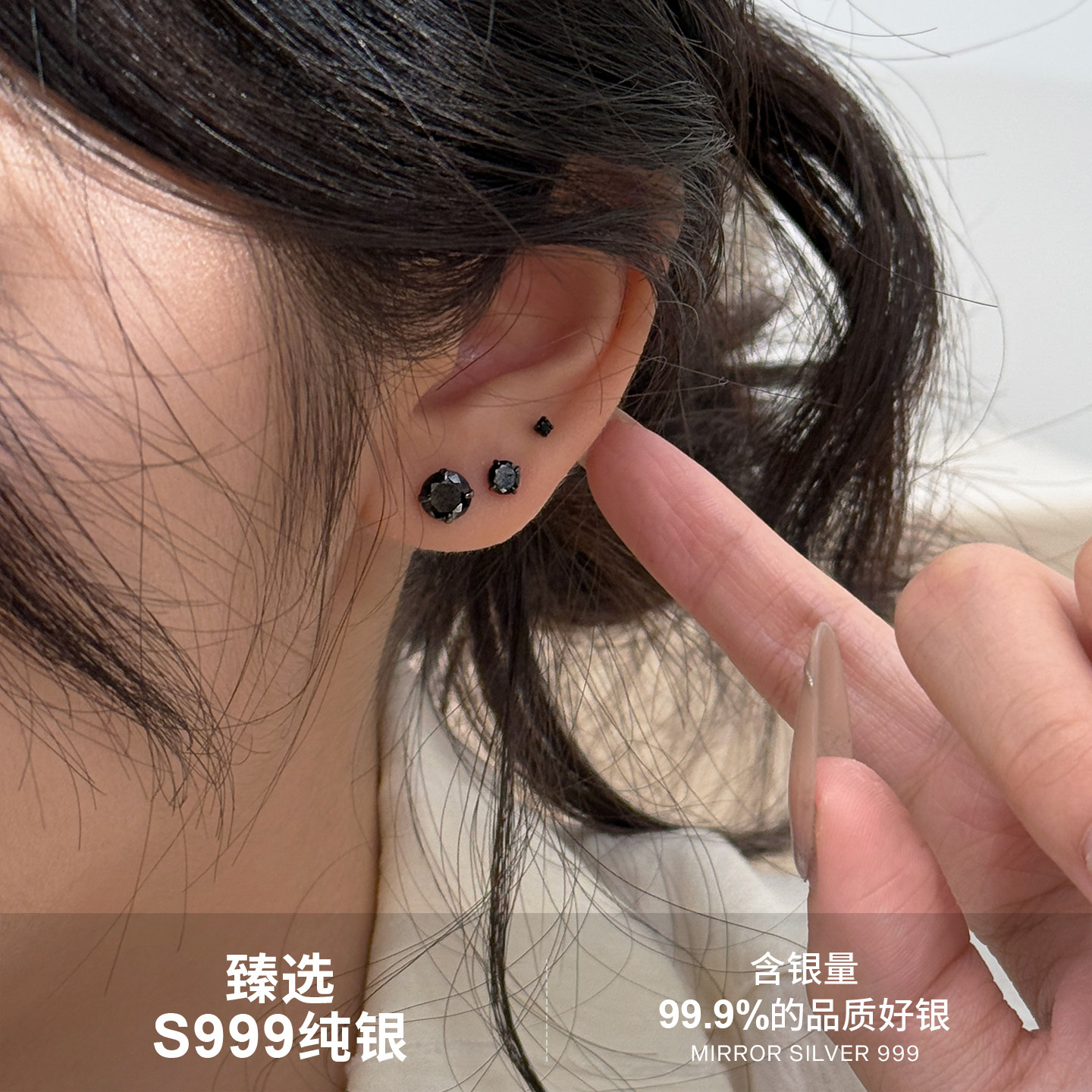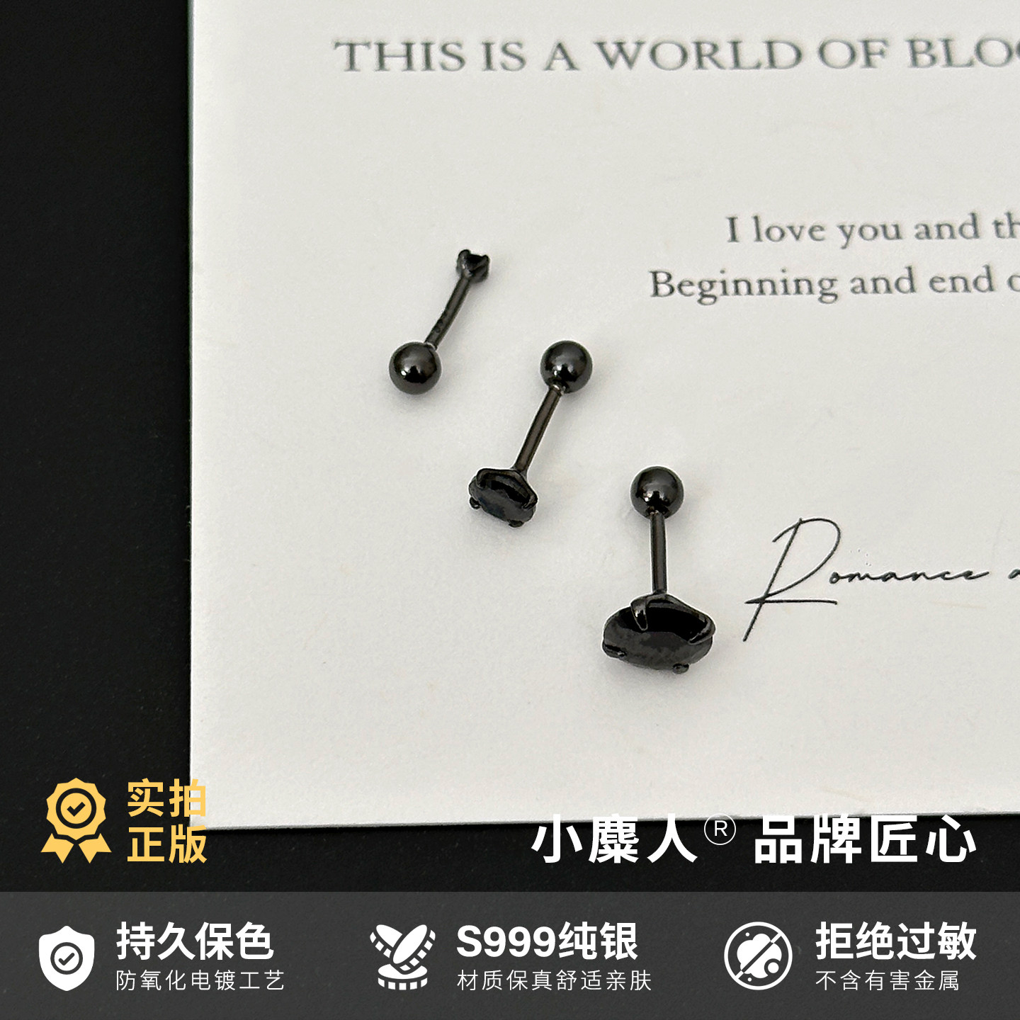 小麋人999纯银简约黑色闪亮耳钉男女耳骨钉耳环耳饰小众养耳新款