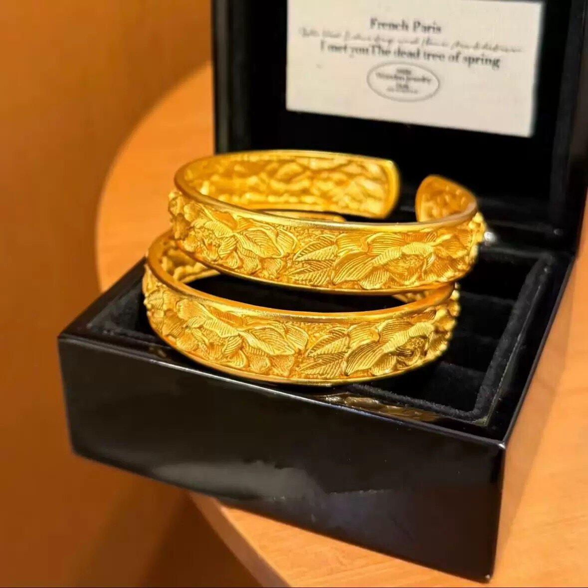 宽版牡丹花沙金手镯彷真黄金实心轮胎覆古新中式国风覆古镯子纯金
