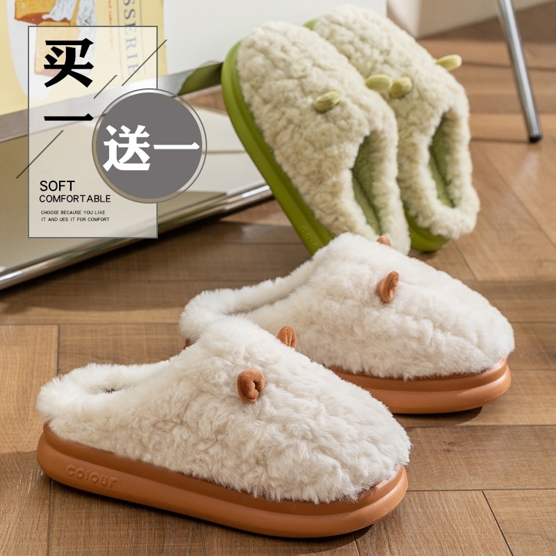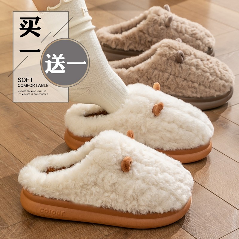 买一送一棉拖鞋女士冬季情侣室内家居一对保暖厚底毛绒棉拖男加绒