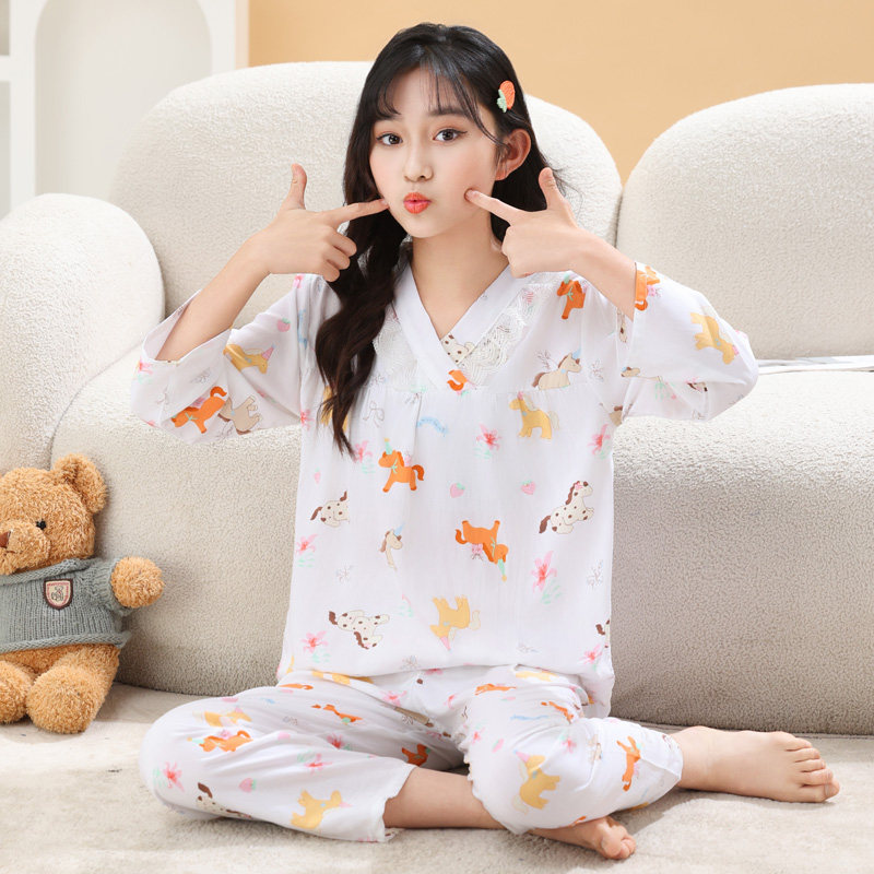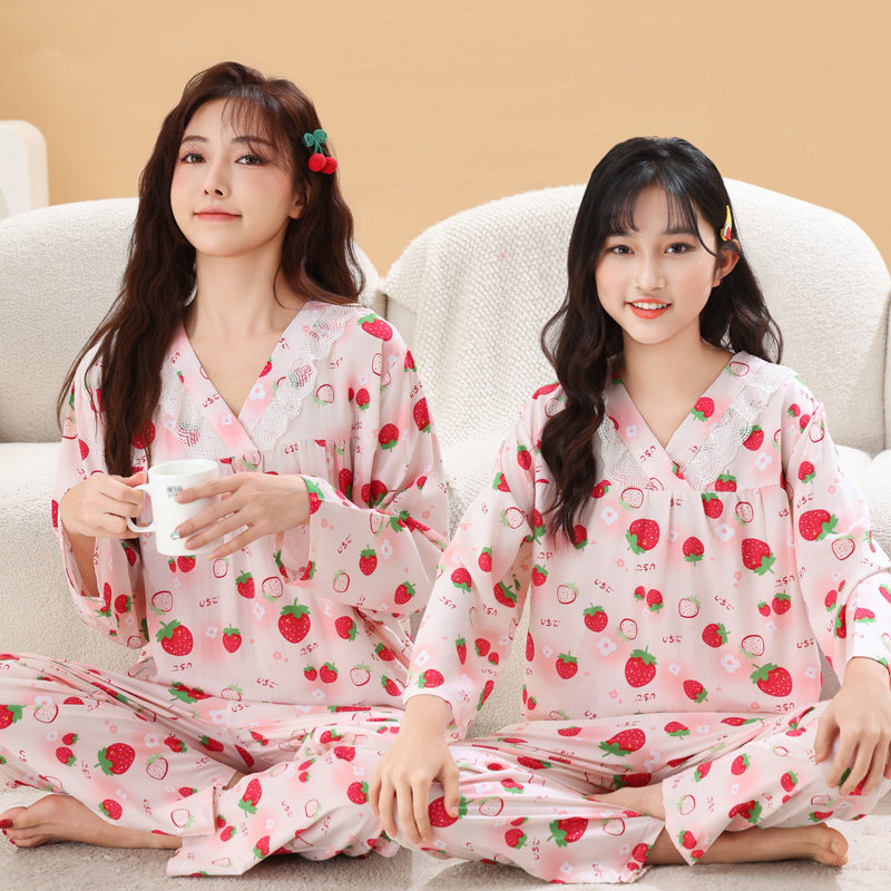 亲子装女童新款棉绸家居服夏季儿童蕾丝花边V领公主睡衣空调套装