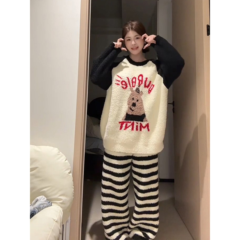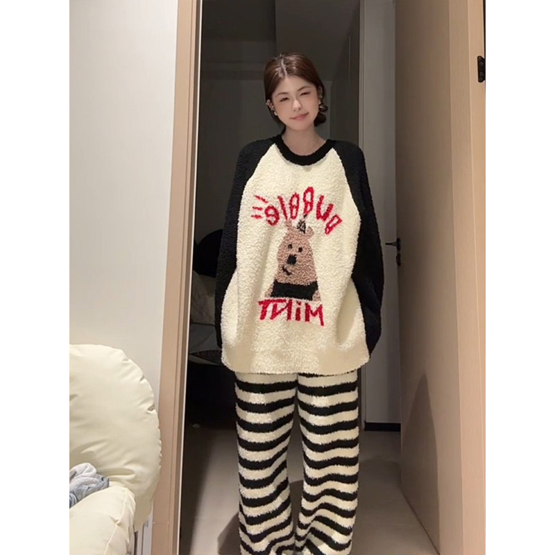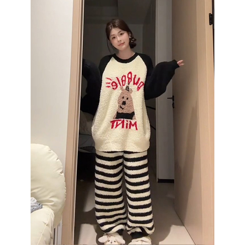 条纹熊珊瑚绒睡衣女秋冬天2025新款高级感半边绒家居服可外穿套装