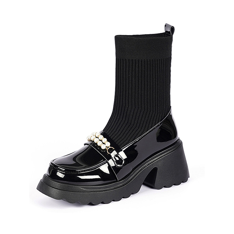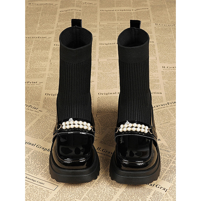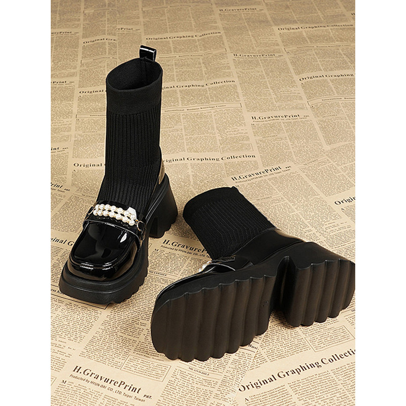 厚底马丁靴女2025秋冬款小个子高跟弹力靴粗跟时尚珍珠瘦瘦靴中跟