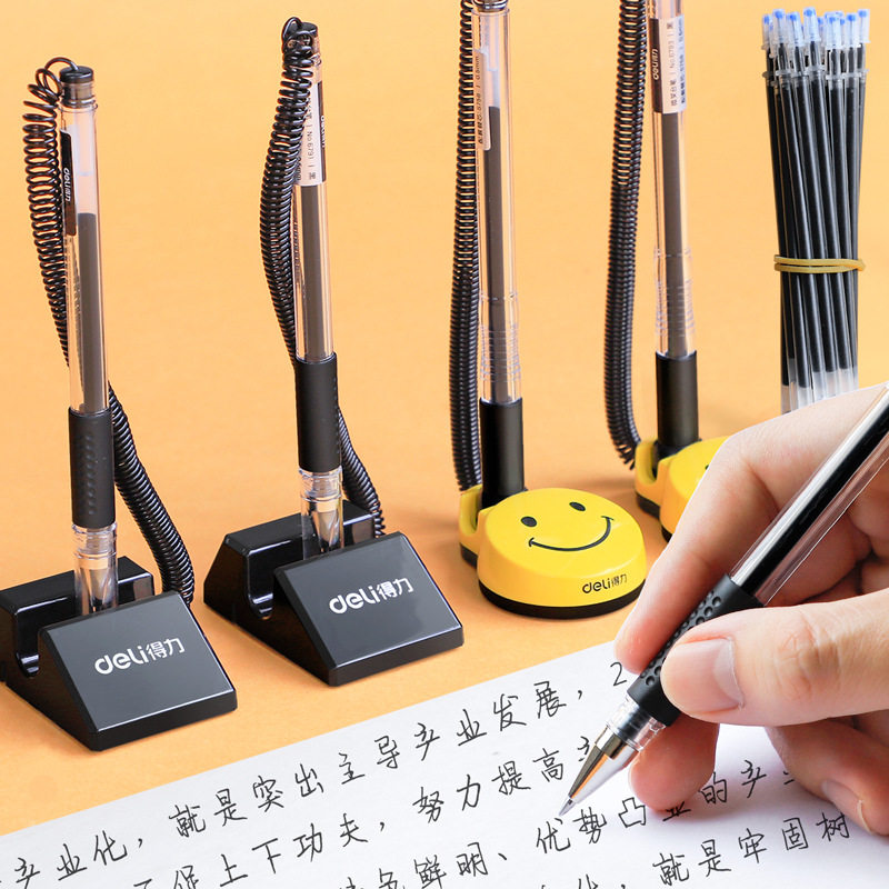 得力柜台笔粘桌笔办公水笔前台桌面签字笔粘在桌子上固定带绳中性