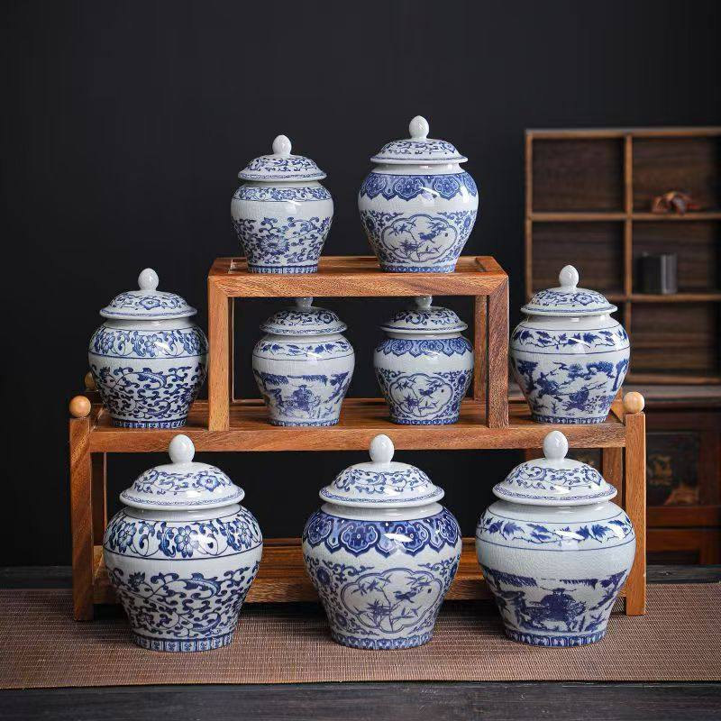 青花陶泥茶叶罐复古老将军陶瓷罐茶叶收纳罐防潮储茶罐干货密封罐