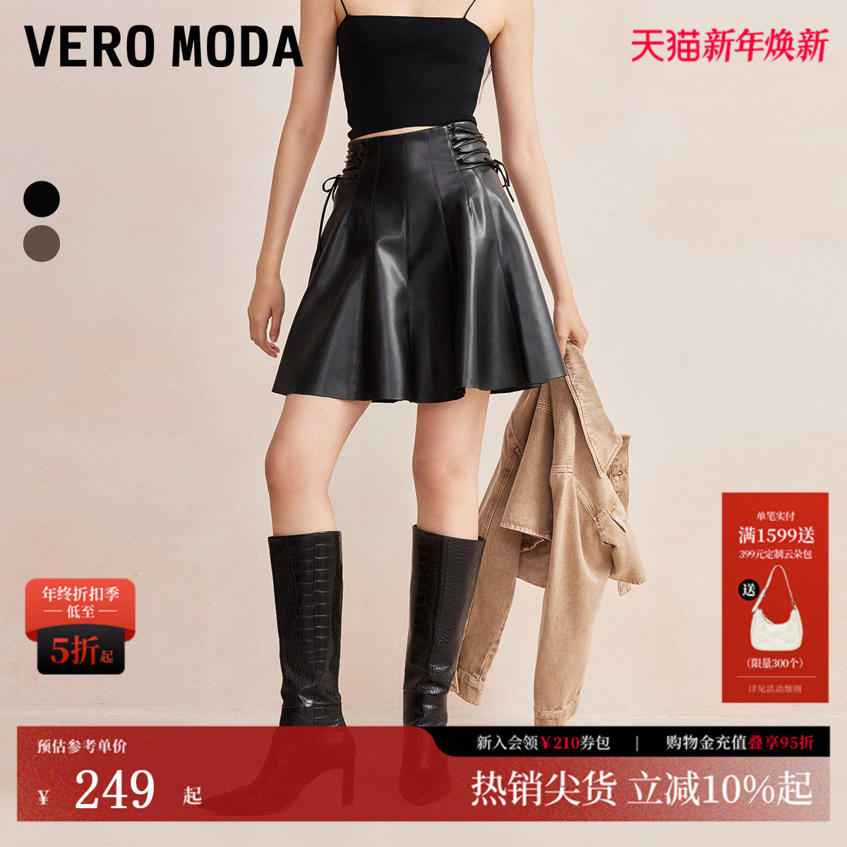 Vero Moda半身裙秋冬高腰系带A字短皮裙百褶裙时尚休闲324316030